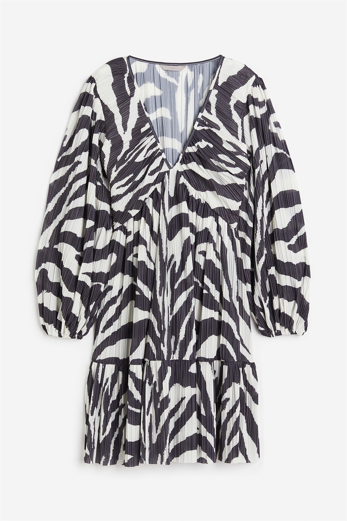 Короткое платье из узкого плиссированного джерси с глубоким V-образным вырезом и длинными рукавами-баллончиками с эластичными манжетами. Присборенный шов на талии и мягко расклешенная юбка с ярусом на подоле для придания дополнительной ширины. На подкладке в области бюста.