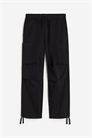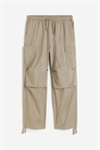 Свободные брюки из хлопковой саржи с обычной талией, скрытым эластичным поясом и утягивающим шнурком. Косые боковые карманы, накладной карман с застежкой на кнопки сзади и два кармана на ногах, один из которых с клапаном и застежкой на кнопки. Глубокие коленные складки и шнурок на концах штанин.