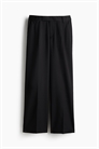 Свободные брюки из саржи со складками в верхней части, ширинка на молнии и удлиненный пояс с потайной застежкой на крючок и глазок. Диагональные боковые карманы, втачные карманы сзади и широкие прямые ноги со складками.