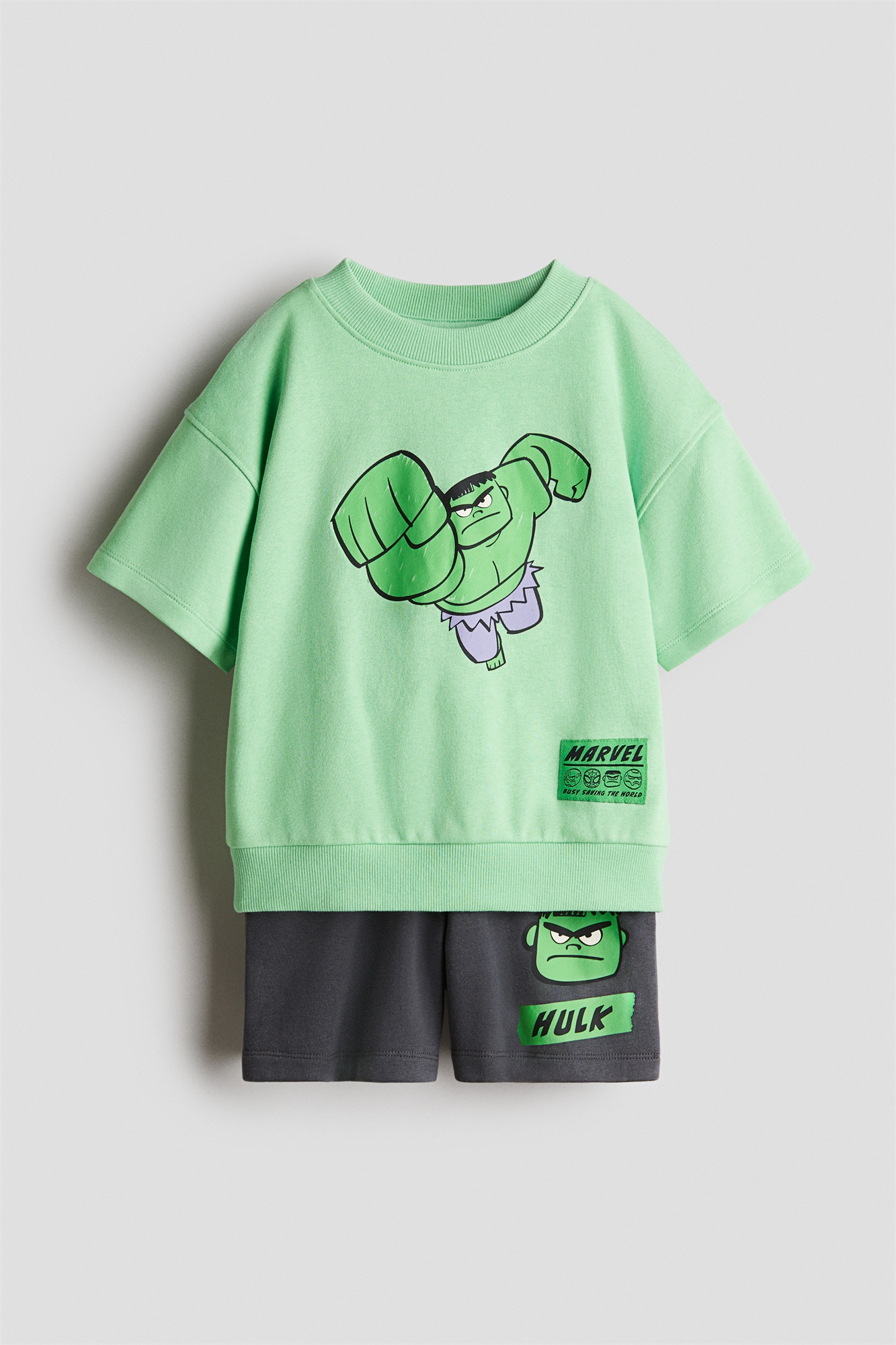 Комплект из футболки и шорт из легкой ткани с принтом. Футболка с непринужденной посадкой, спущенными плечами и широкими короткими рукавами. Окантовка по вырезу горловины и подолу. Шорты с эластичным поясом и неброскими боковыми карманами.