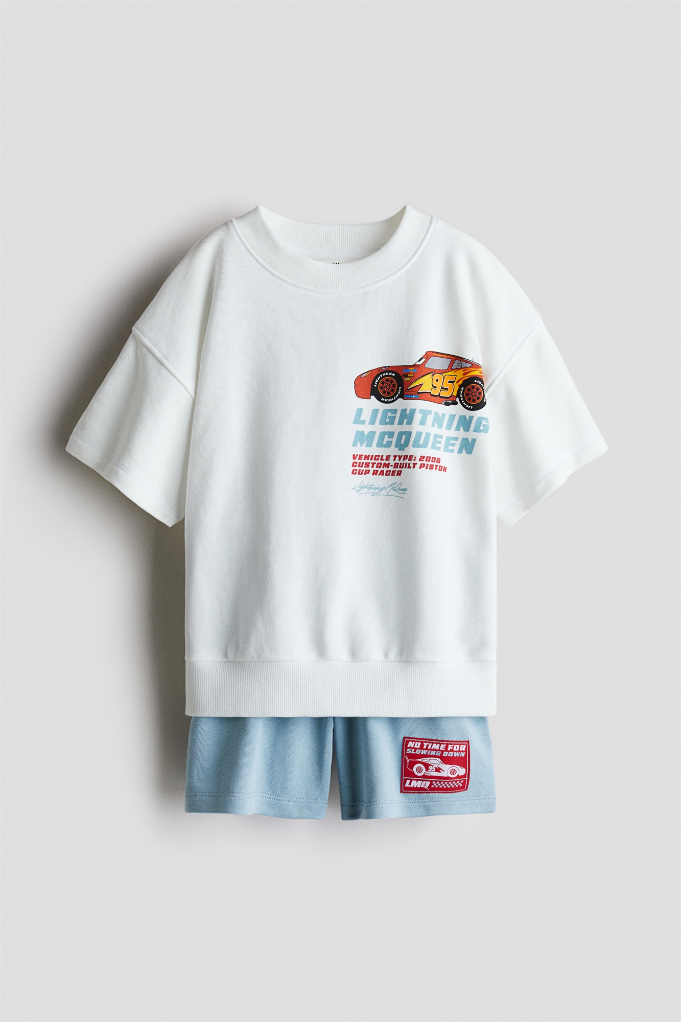 Комплект из футболки и шорт из легкой ткани с принтом. Футболка с непринужденной посадкой, спущенными плечами и широкими короткими рукавами. Окантовка по вырезу горловины и подолу. Шорты с эластичным поясом и неброскими боковыми карманами.