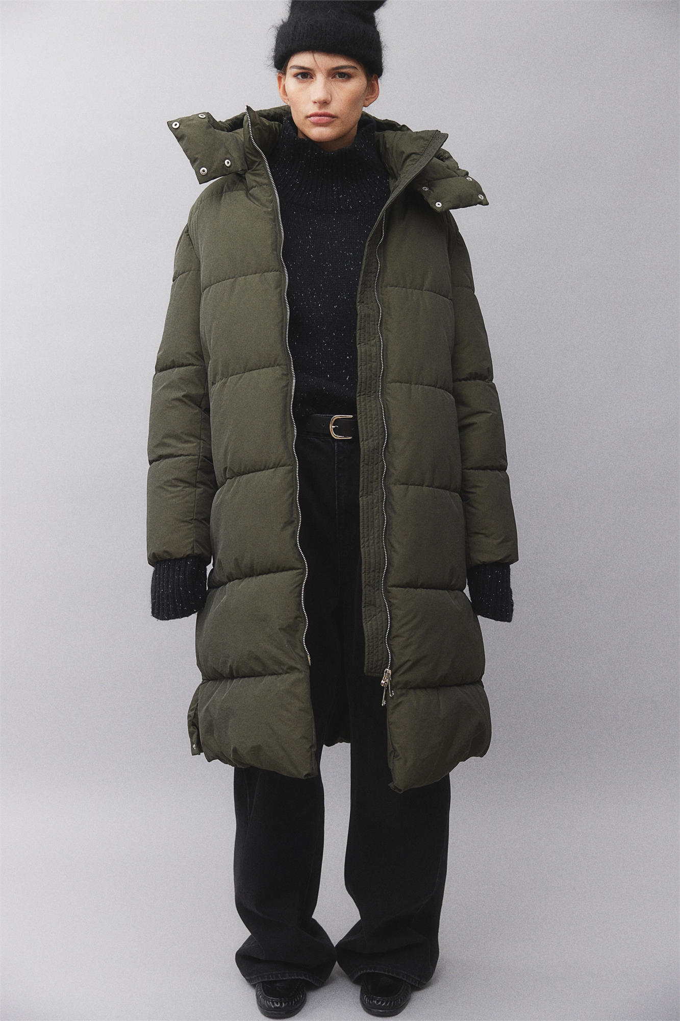 Стеганое пуховое пальто из водоотталкивающей и ветрозащитной ткани. Свободный крой с воротником-стойкой, двусторонняя застежка-молния спереди и капюшон с эластичным шнурком и ограничителями для регулировки посадки. Спущенные плечи, диагональные накладные боковые карманы, прорезь с кнопками с каждой стороны и скрытая эластичная резинка на манжетах и подоле. На подкладке.