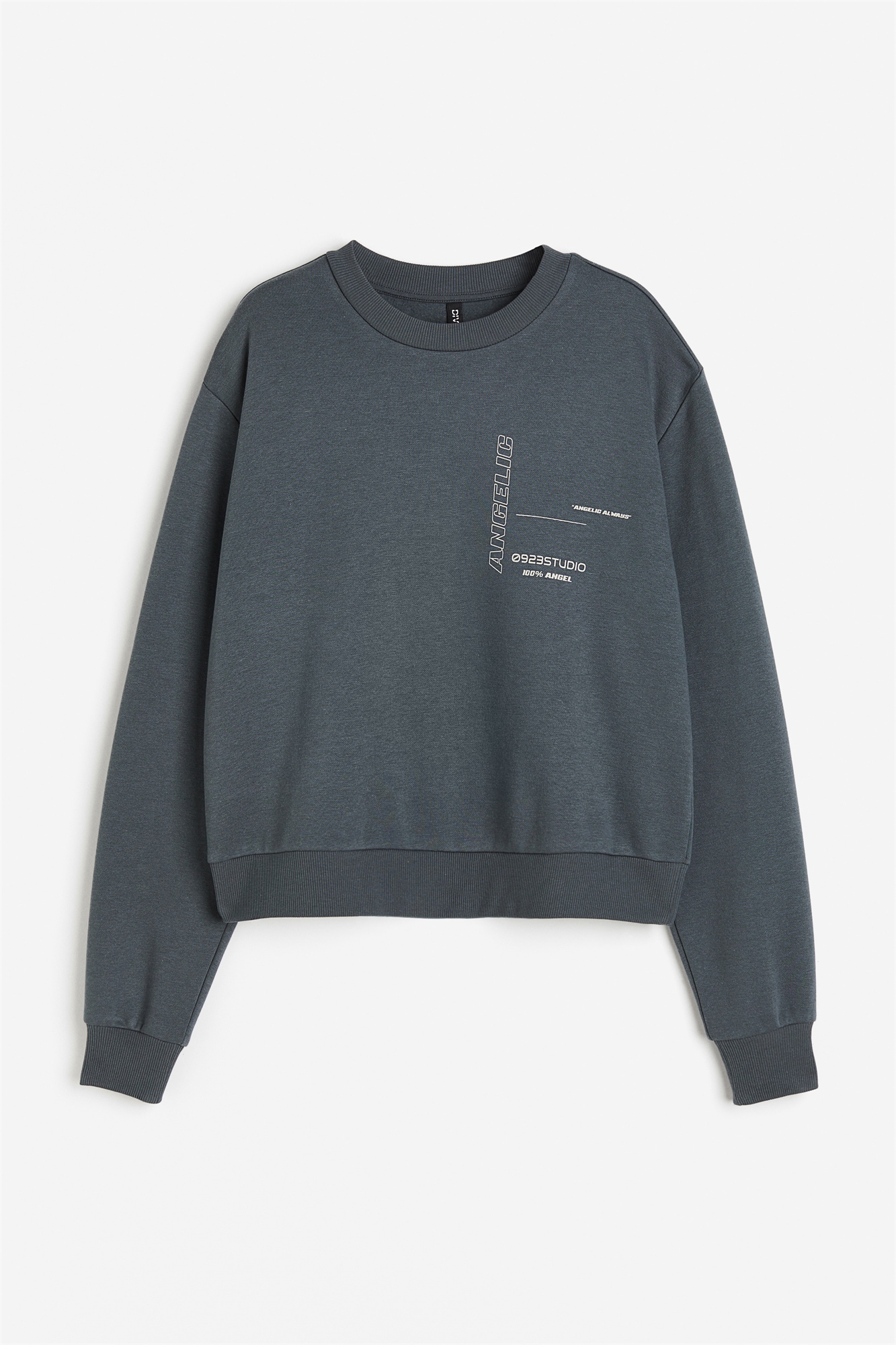 Короткий топ из толстовочной ткани с мягкой начесом внутри и принтом спереди. Круглый вырез с ребристой отделкой, спущенные плечи и длинные рукава. Ребристые манжеты и подол.