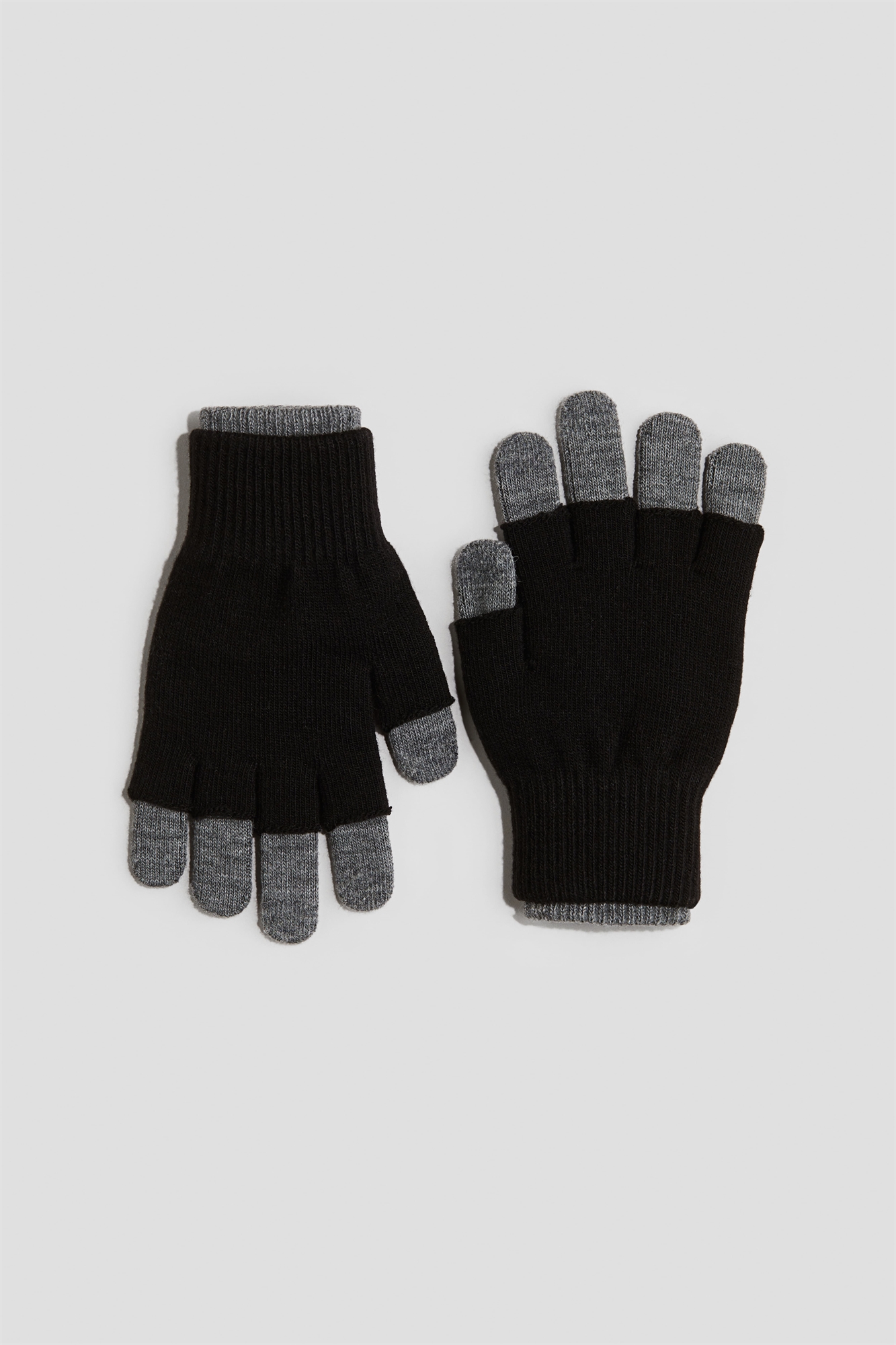 Тонкие вязаные перчатки с соответствующими перчатками без пальцев. Верхняя часть большого, указательного и среднего пальцев выполнена из материала, совместимого с сенсорными экранами. Перчатки можно носить как друг с другом, так и отдельно.