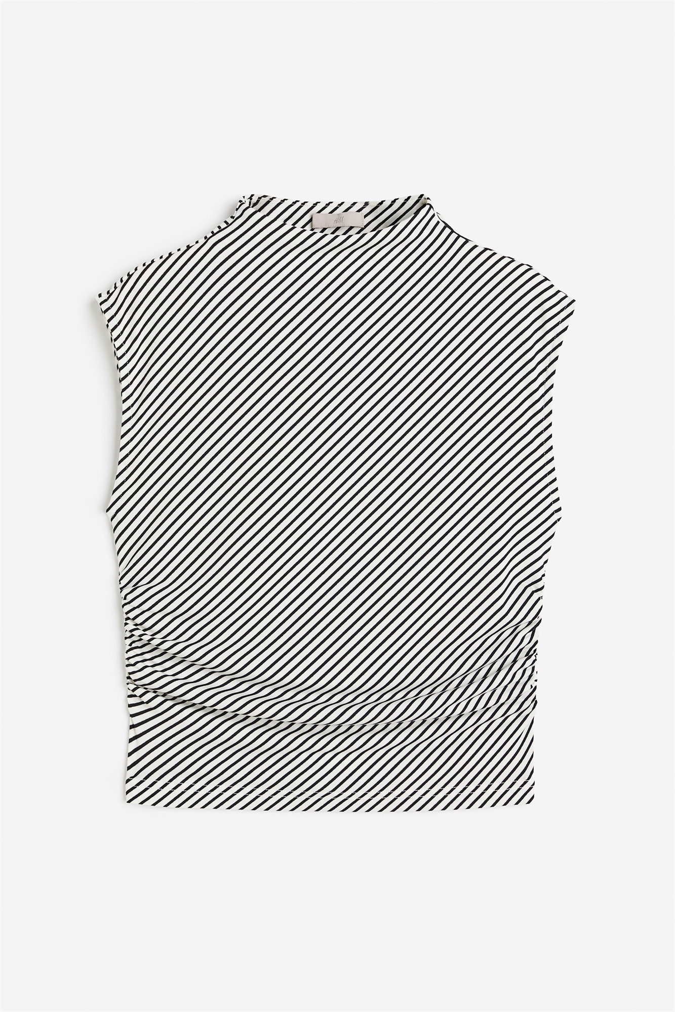Обрезанный топ без рукавов из джерси с водолазкой. Приталенный фасон со сборками по боковым швам для легкой драпировки.