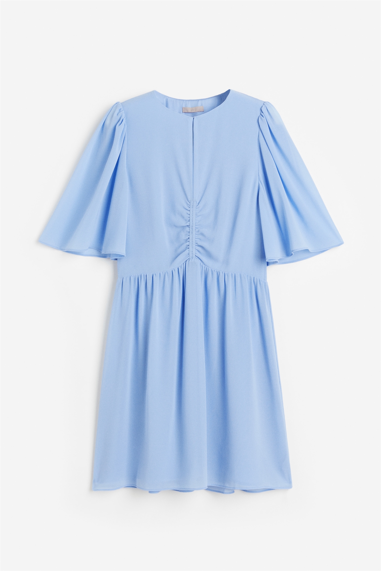 Короткое платье из прозрачного крепа с круглым вырезом и отверстием спереди с потайной пуговицей в верхней части. Широкие рукава-бабочки и эластичный, сборчатый шов спереди, создающий эффект рюша. Узкая эластичная резинка на талии и расклешенная юбка. Атласная подкладка.