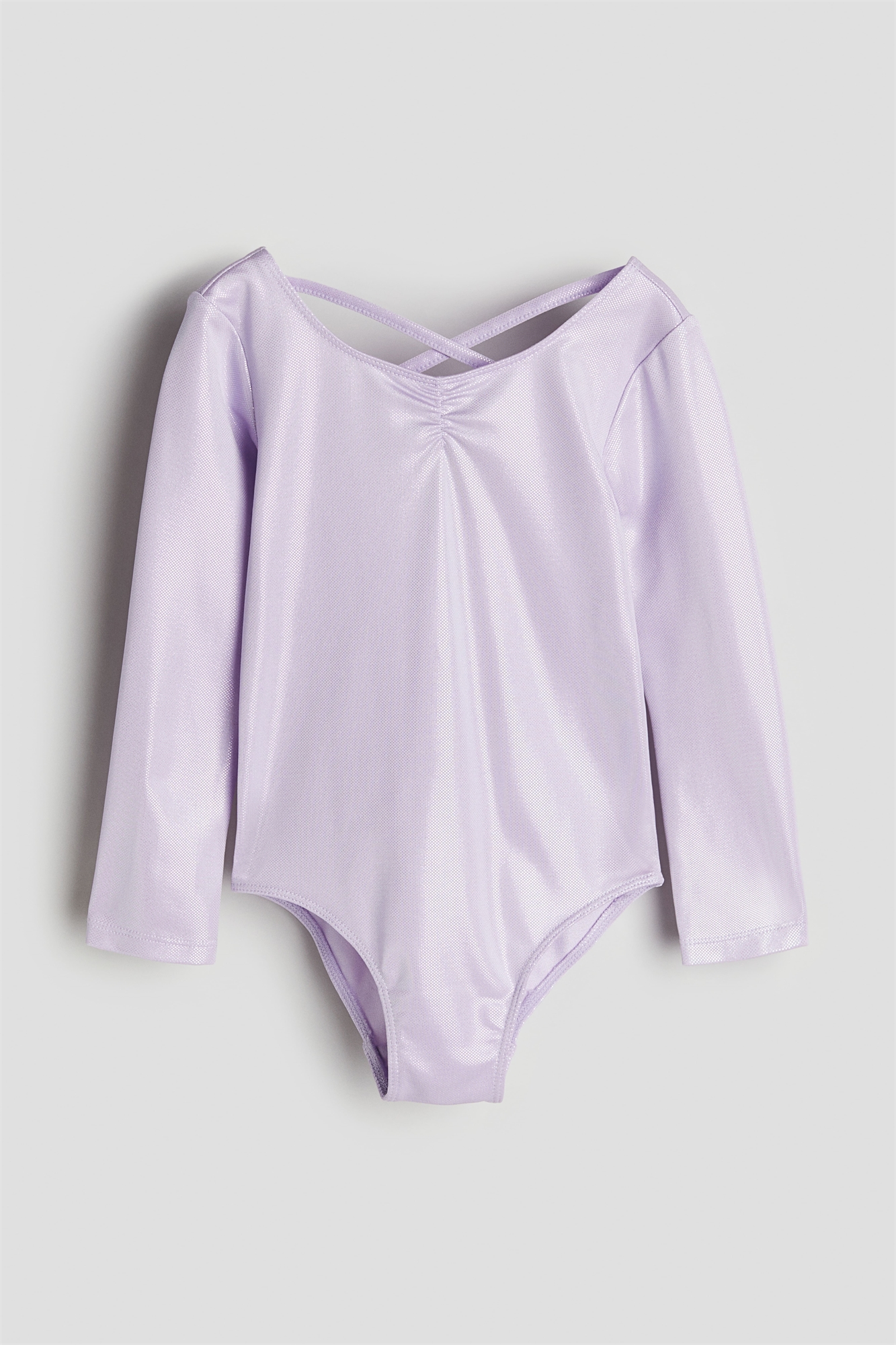Купальник из блестящего трикотажа с декоративными складками в верхней части, перекрещивающимися бретелями сзади и длинными рукавами.