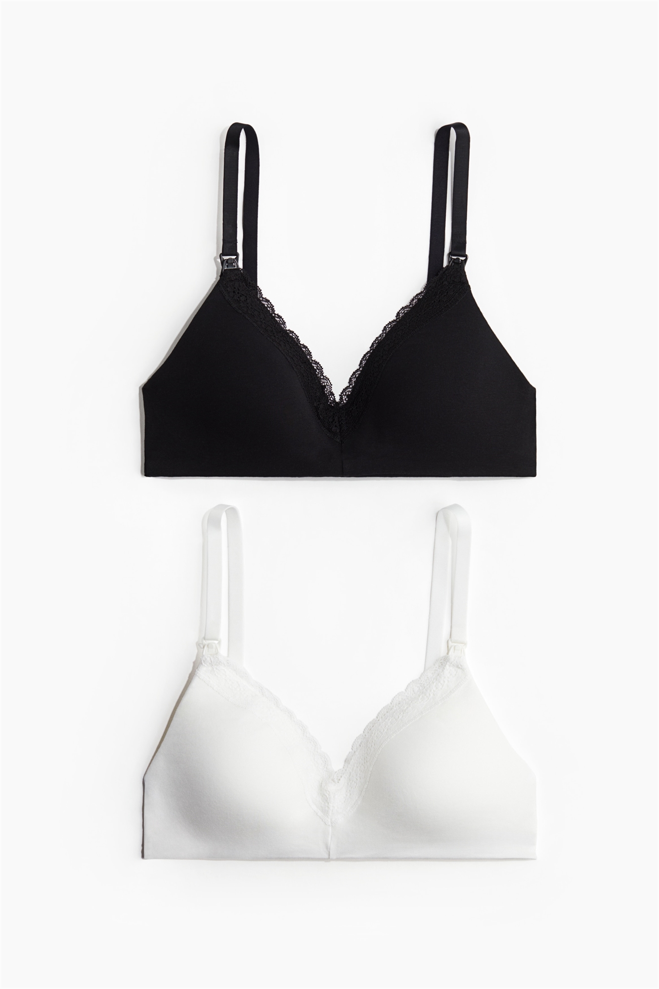 Мягкие бюстгальтеры для кормления без проводов из хлопкового джерси с узкой кружевной отделкой и мягкими открытыми чашечками с местами для вкладышей для кормления. Регулируемые бретели. Застежка на крючки и глазки сзади.