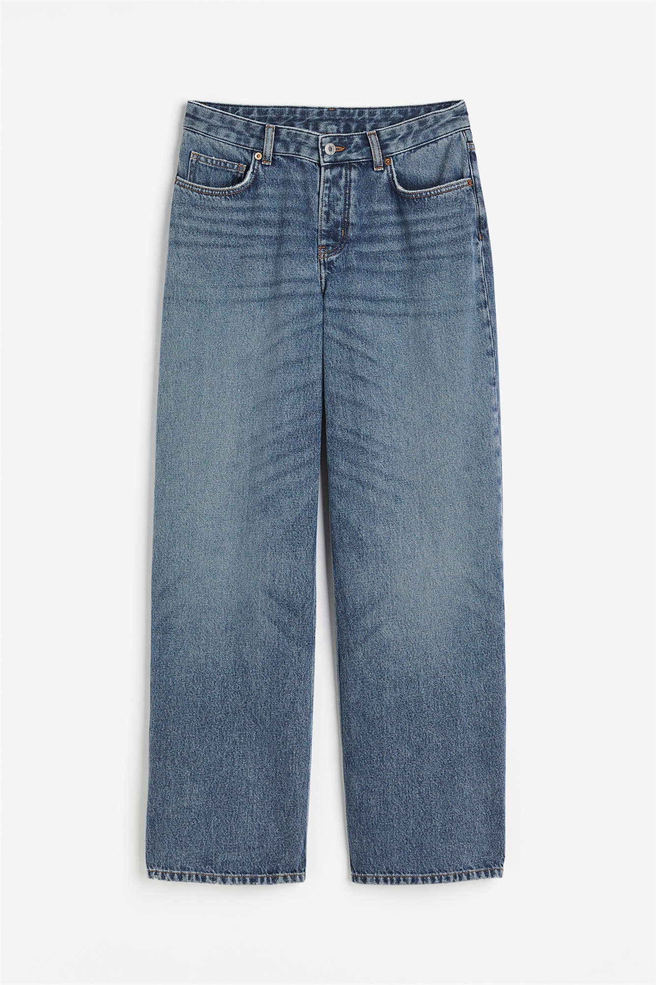 Джинсы с 5 карманами из хлопкового денима с обычной талией. Широкие штанины с обычной посадкой от талии до бедер и прямым, широким кроем от бедра до подола. Обычная длина, рассчитанная на то, чтобы доходить до верхней части стопы с небольшим запасом или вообще без запаса.