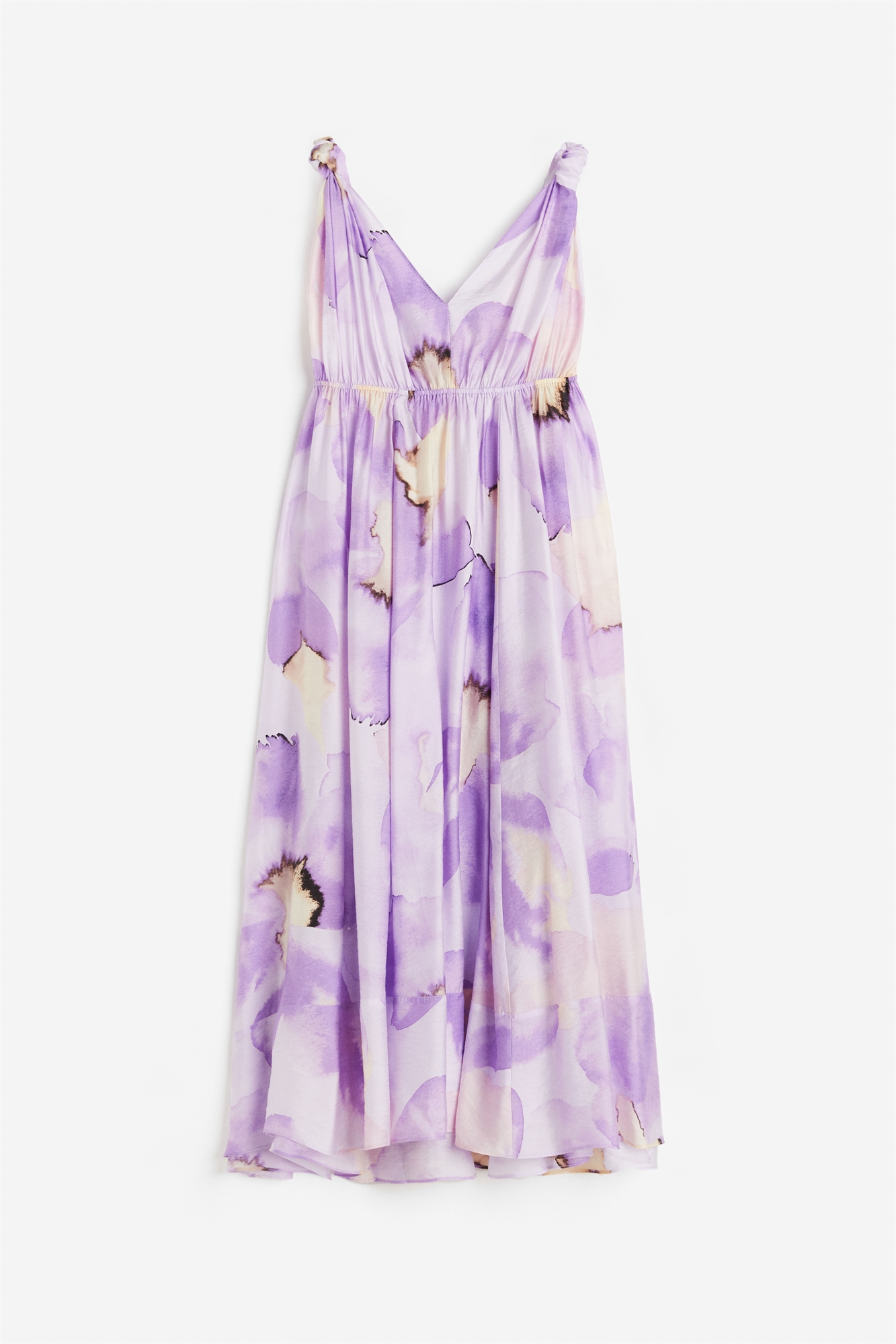Платье длиной до колен из тканого материала из смеси лиоцелла. Глубокий V-образный вырез и широкие, завязанные узлом бретели, соединяющиеся сзади. Узкая эластичная резинка на талии и слегка расклешенная юбка. Без подкладки.