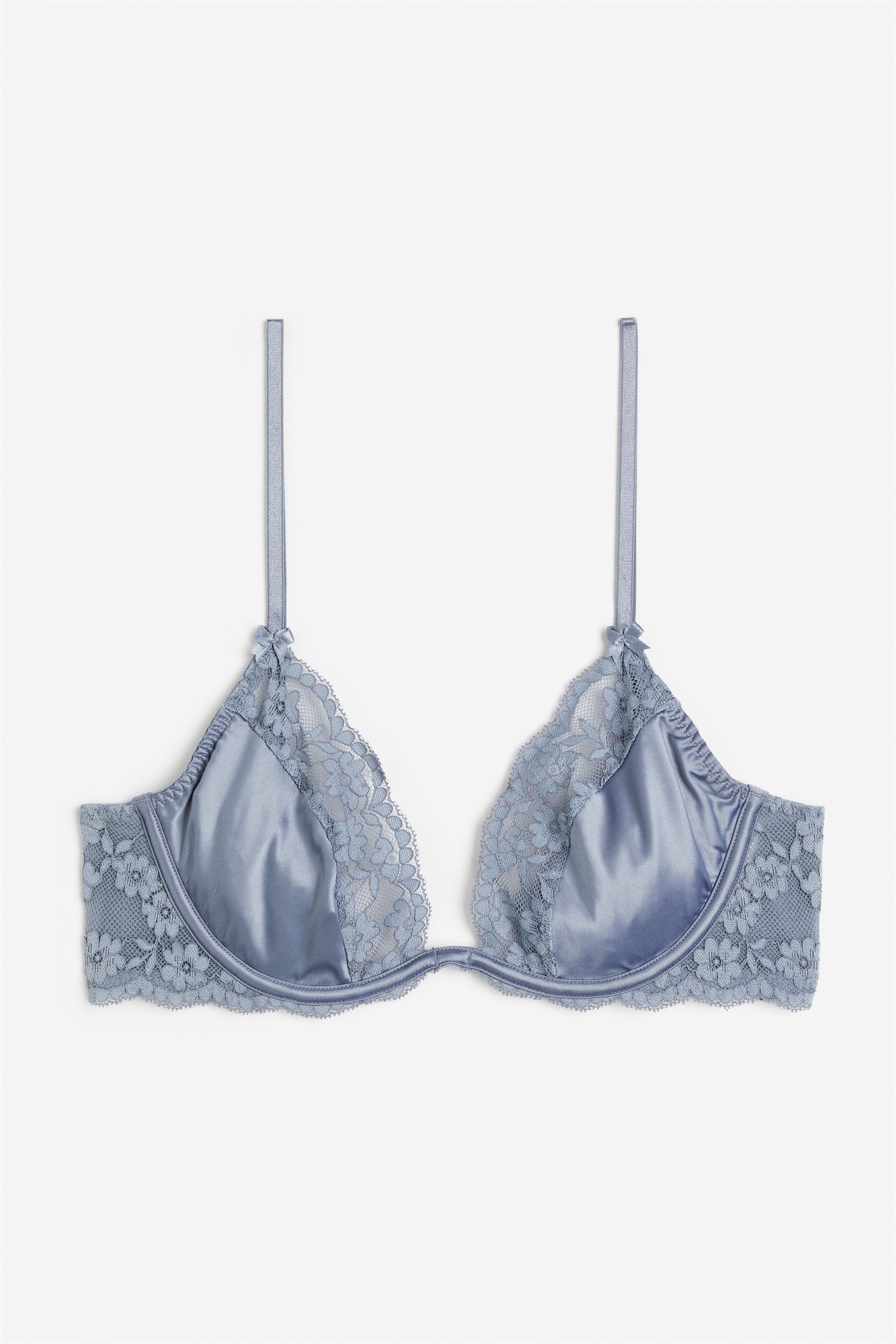 Бюстгальтер из атласа и кружева без подкладки с регулируемыми бретелями и чашечками с сетчатой подкладкой, которые придают бюсту естественную форму и обеспечивают легкую поддержку. Застежка на крючки и глазки сзади.