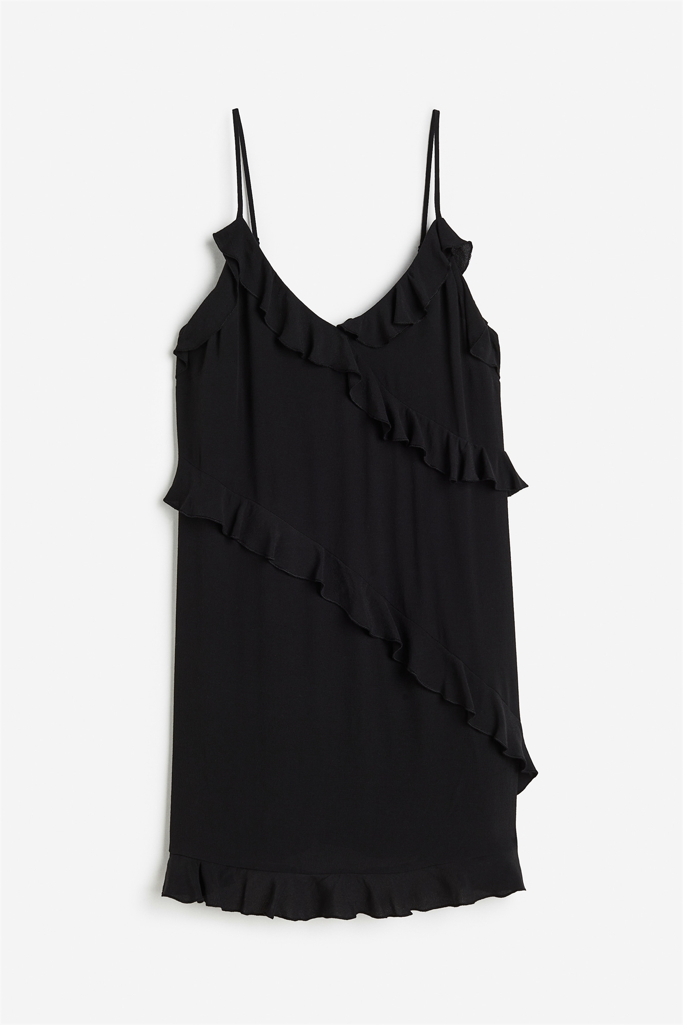 Короткое приталенное платье из вискозного крепа с V-образным вырезом и узкими регулируемыми бретелями. Отделка воланами в верхней части, продолжающаяся спереди и сзади, и подол с воланами. Без подкладки.