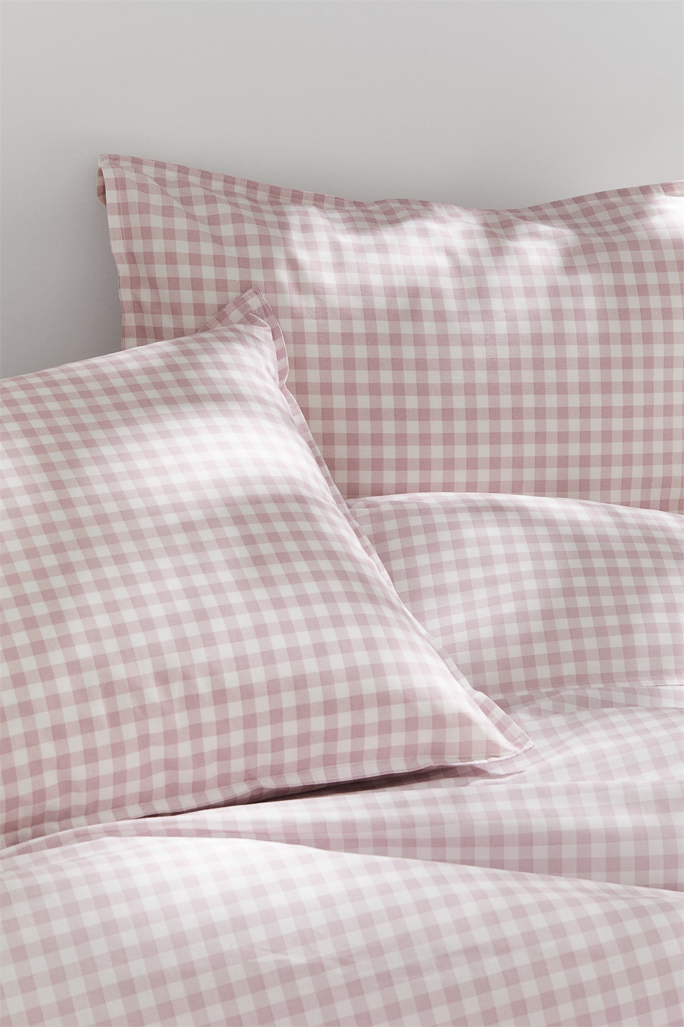 Двуспальный комплект постельного белья из хлопка в клетку "Гингема" с количеством нитей 144. Пододеяльник застегивается снизу на потайные металлические кнопки. Две наволочки с отверстием конверт.