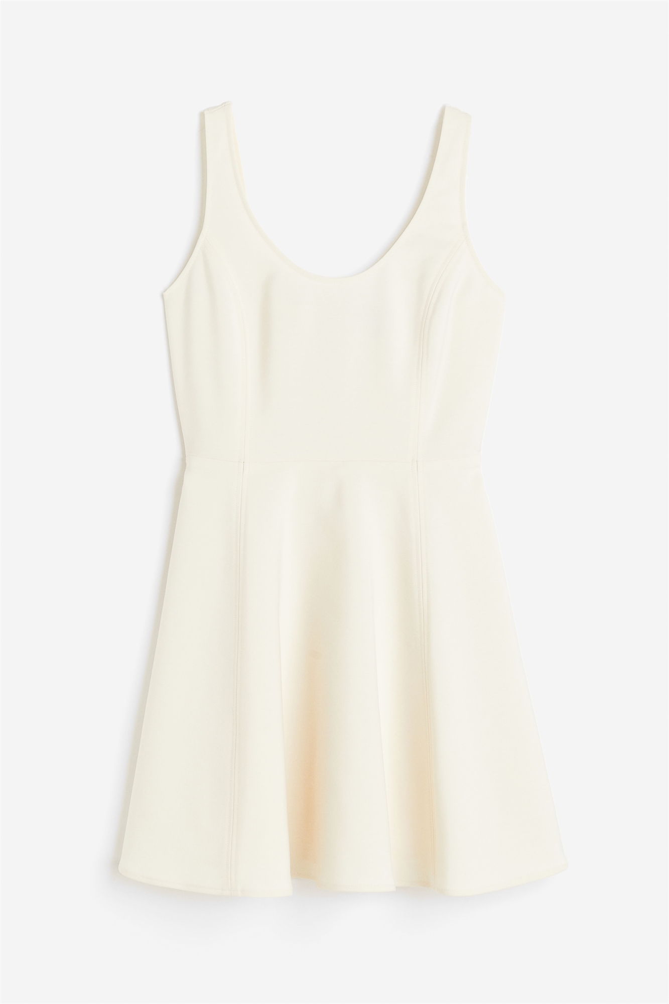 Короткое платье из мягкой ткани с глубоким круглым вырезом, широкими бретелями и потайной застежкой на молнию и крючок с глазками сзади. Облегающий лиф, шов на талии и расклешенная юбка. Без подкладки.