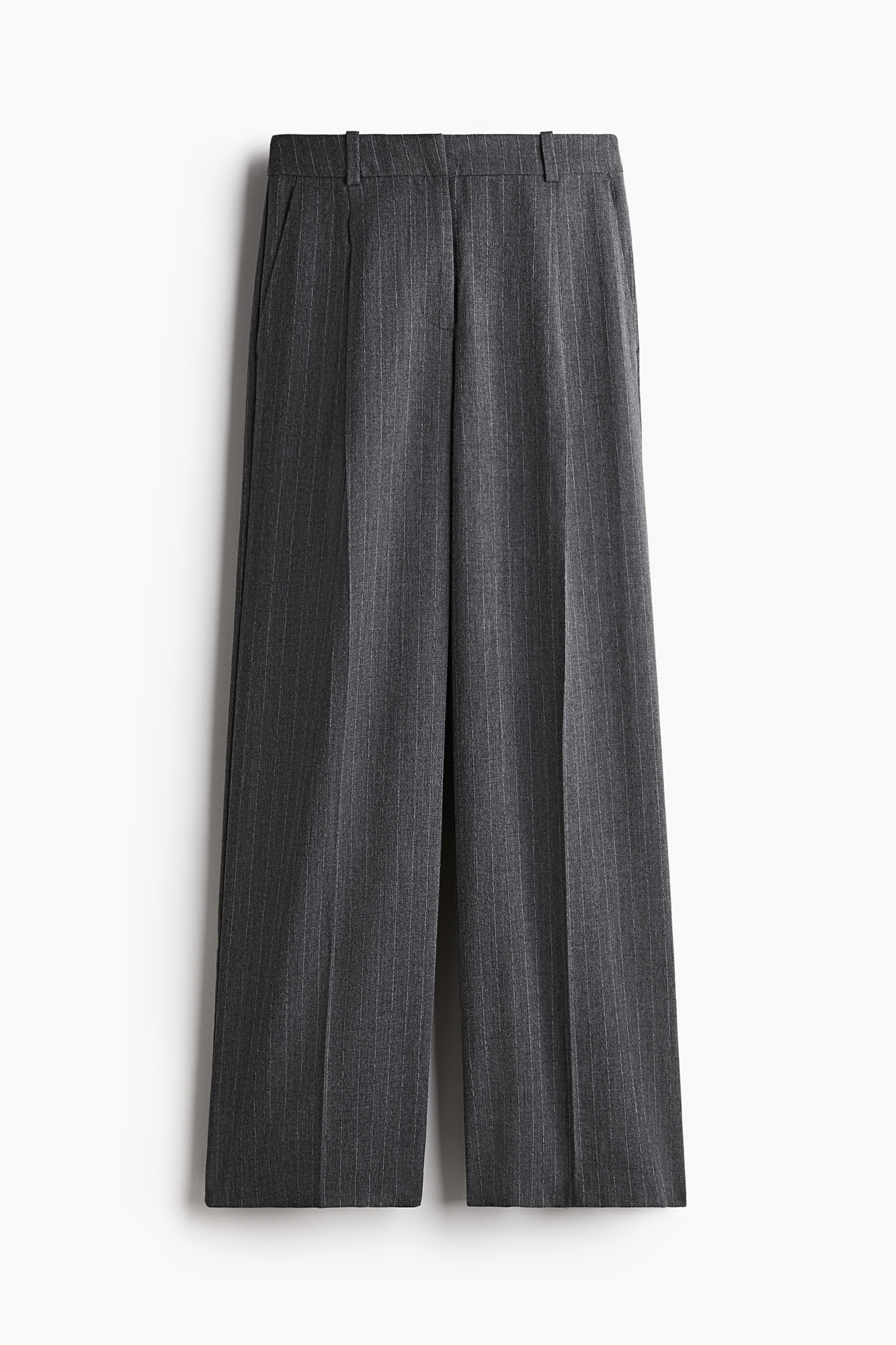 Приталенные брюки из тканого материала. Высокая талия, ширинка на молнии, потайная застежка на пуговицах и крючках. Диагональные боковые карманы, втачные карманы сзади и широкие прямые ноги со складками в верхней части и складками спереди и сзади.