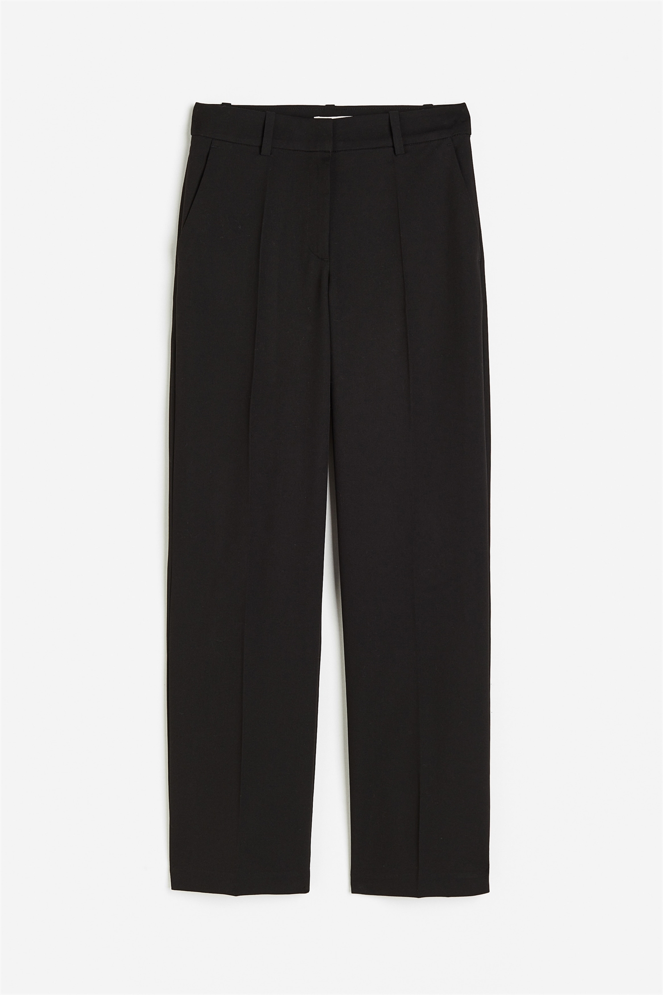 Приталенные брюки из саржи. Регулярная талия, ширинка на молнии, потайная застежка на пуговицу и крючок с ушком. Диагональные боковые карманы, втачные задние карманы и прямые ноги со складками спереди и сзади.