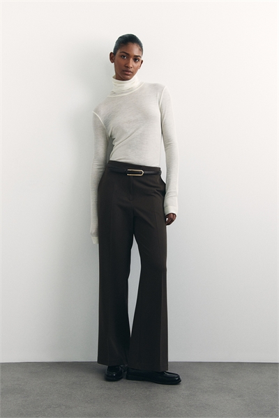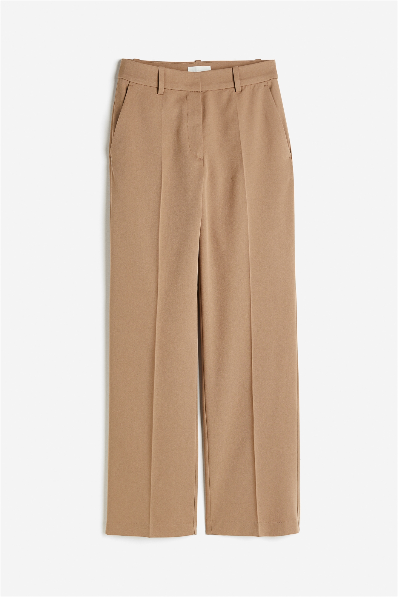 Приталенные брюки из саржи. Регулярная талия, ширинка на молнии, потайная застежка на пуговицу и крючок с ушком. Диагональные боковые карманы, втачные задние карманы и прямые ноги со складками спереди и сзади.