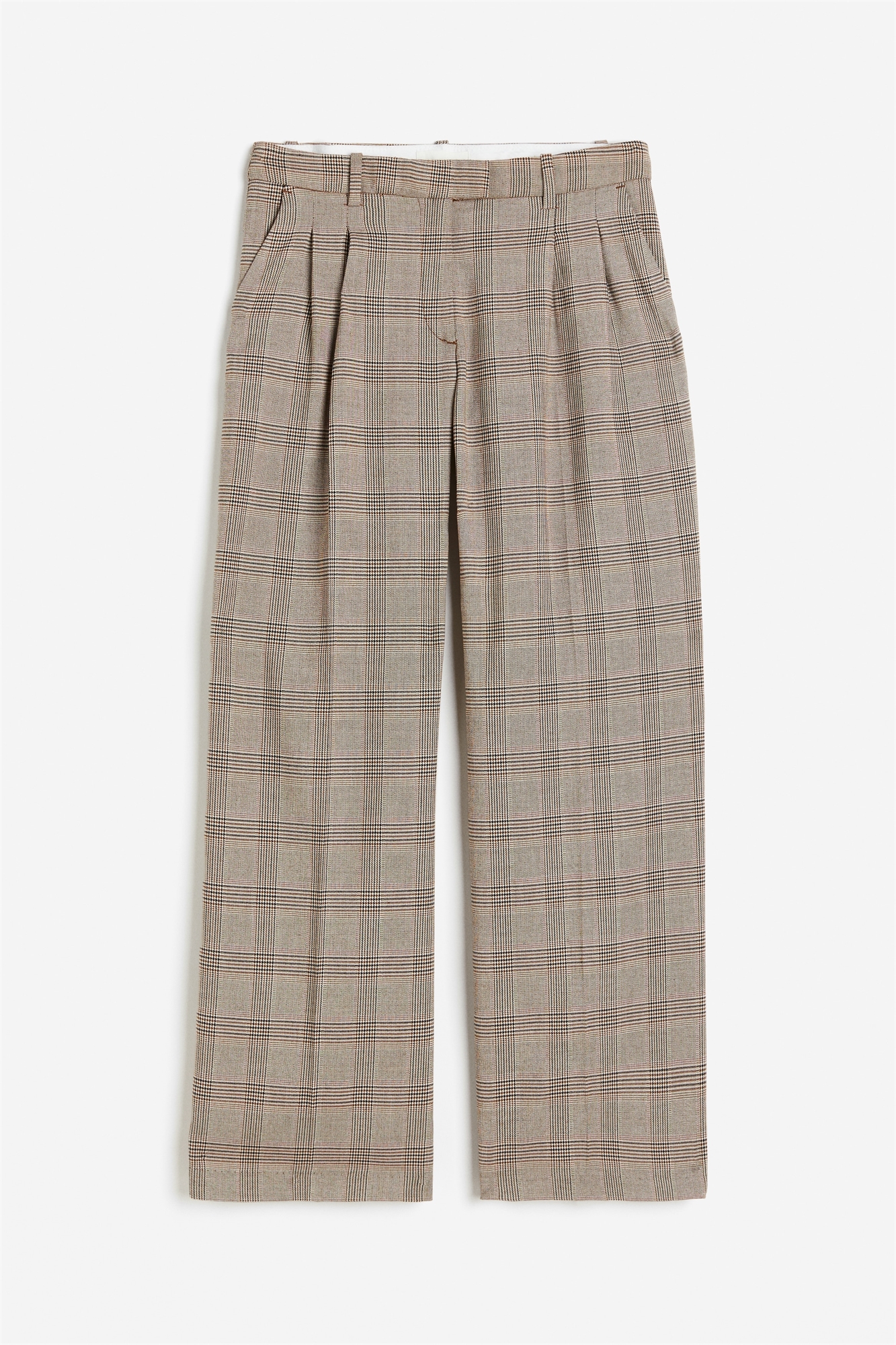 Свободные приталенные брюки из саржи с зауженным поясом, ширинкой на молнии и удлиненным поясом с потайной застежкой на пуговицу и крючок с ушком. Складки в верхней части, диагональные боковые карманы, прорезные задние карманы и широкие прямые ноги со складками.