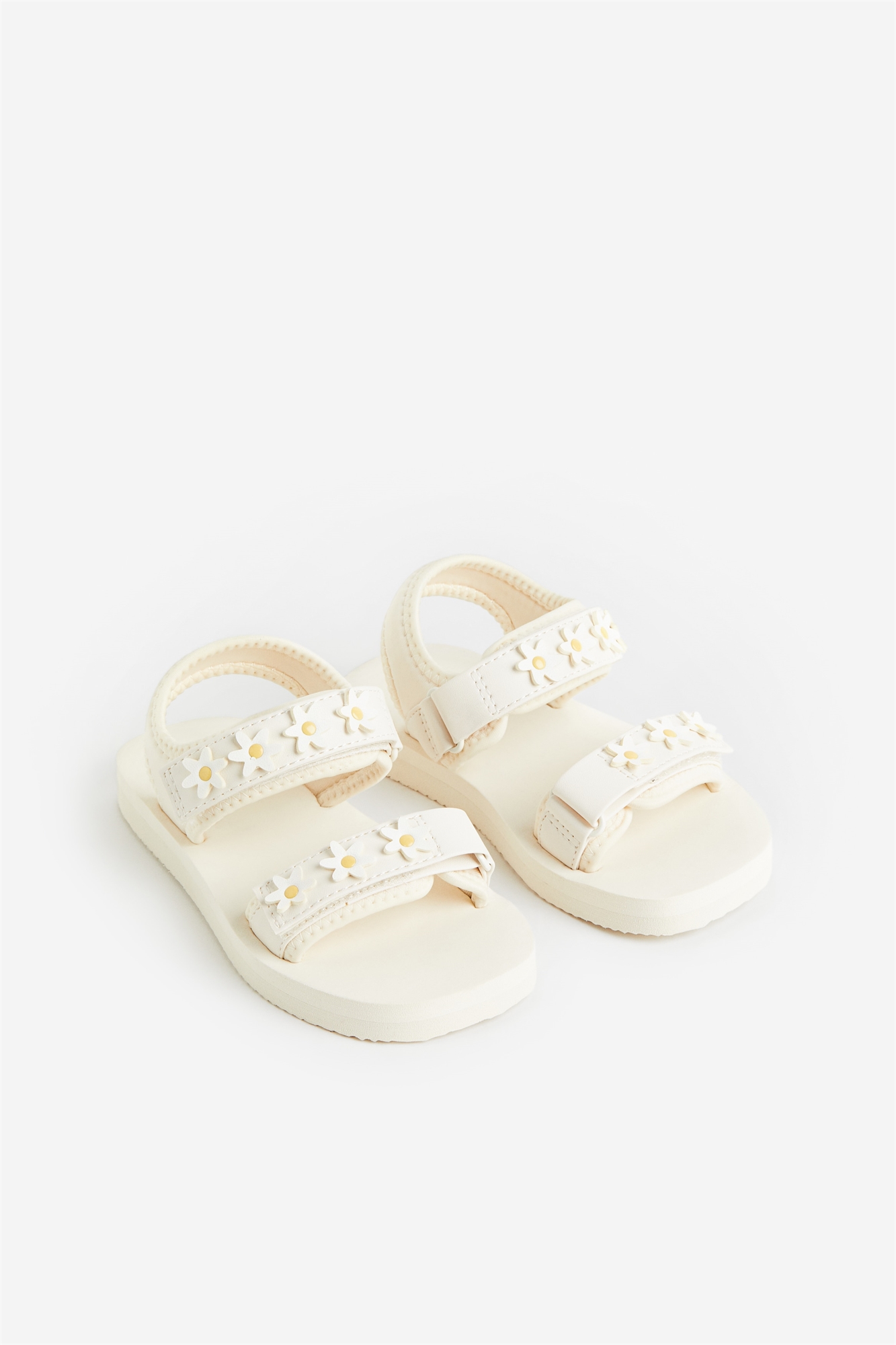 Сандалии из скубы с аппликацией на ноге и ремешками на лодыжках с регулируемой застежкой на крючки и петли. Ремешок на пятке для фиксации. Рифленая подошва. Высота подошвы 2,2 см.