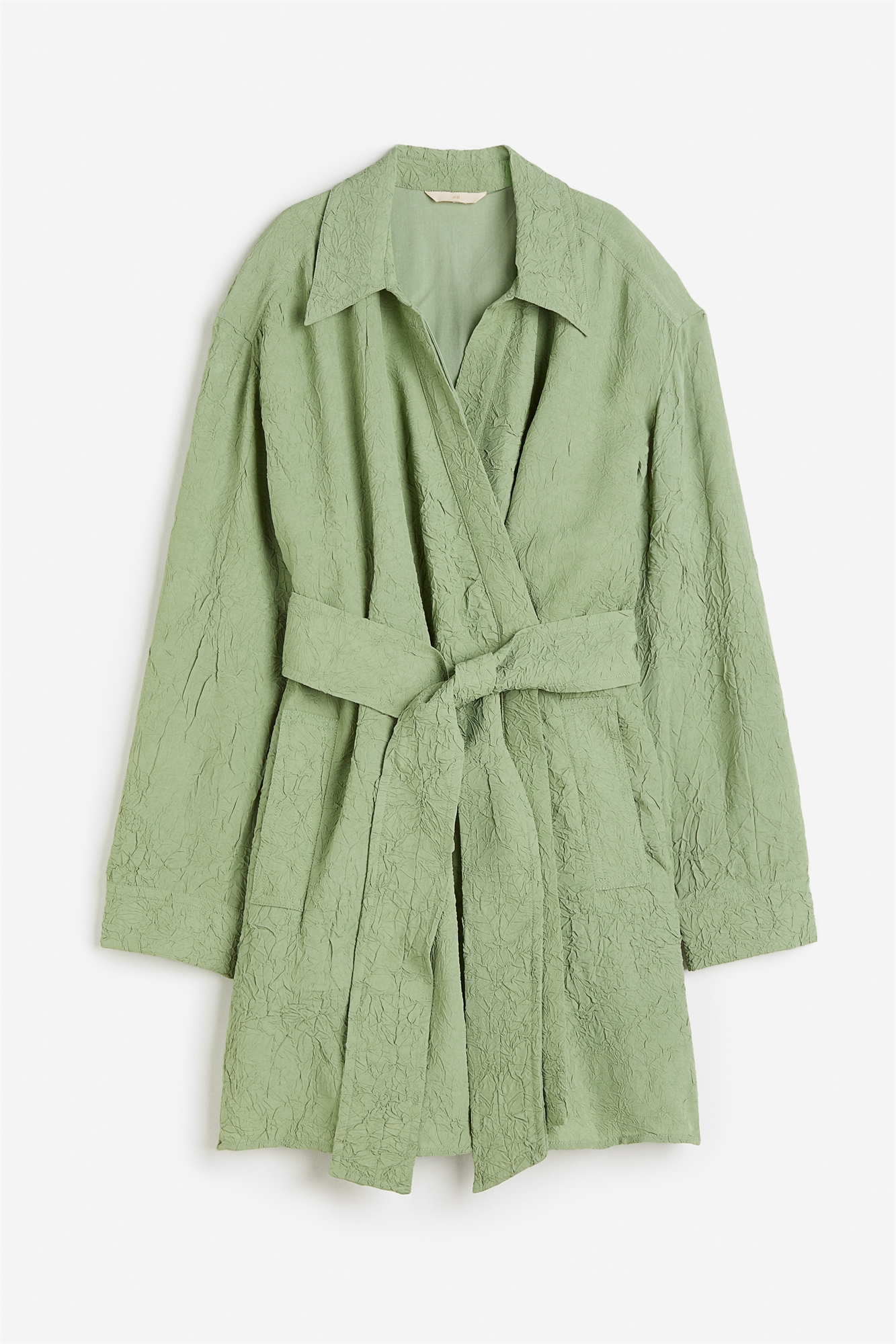 Короткое платье свободного покроя из фактурного плетения с воротником, V-образным вырезом и облегающим передом с потайными пуговицами с одной стороны. Боковые карманы и широкий съемный пояс на талии. Спущенные плечи и длинные рукава с манжетами на пуговицах.