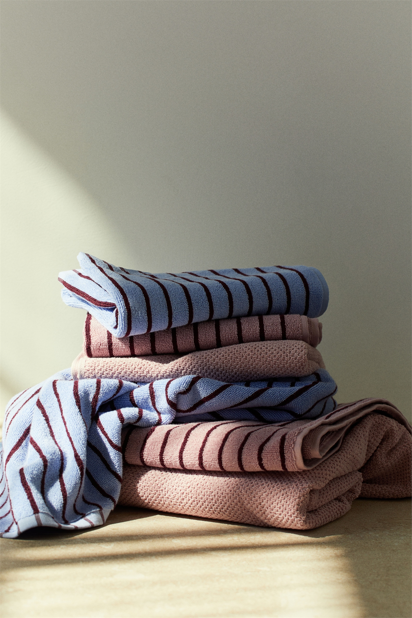 Полотенце для рук из мягкой хлопковой махры с высокой степенью впитываемости. Полосы, окрашенные пряжей, легко сочетаются с однотонными полотенцами, создавая современный и элегантный образ дома. Петля в верхней части для подвешивания. Вес: 480 GSM.