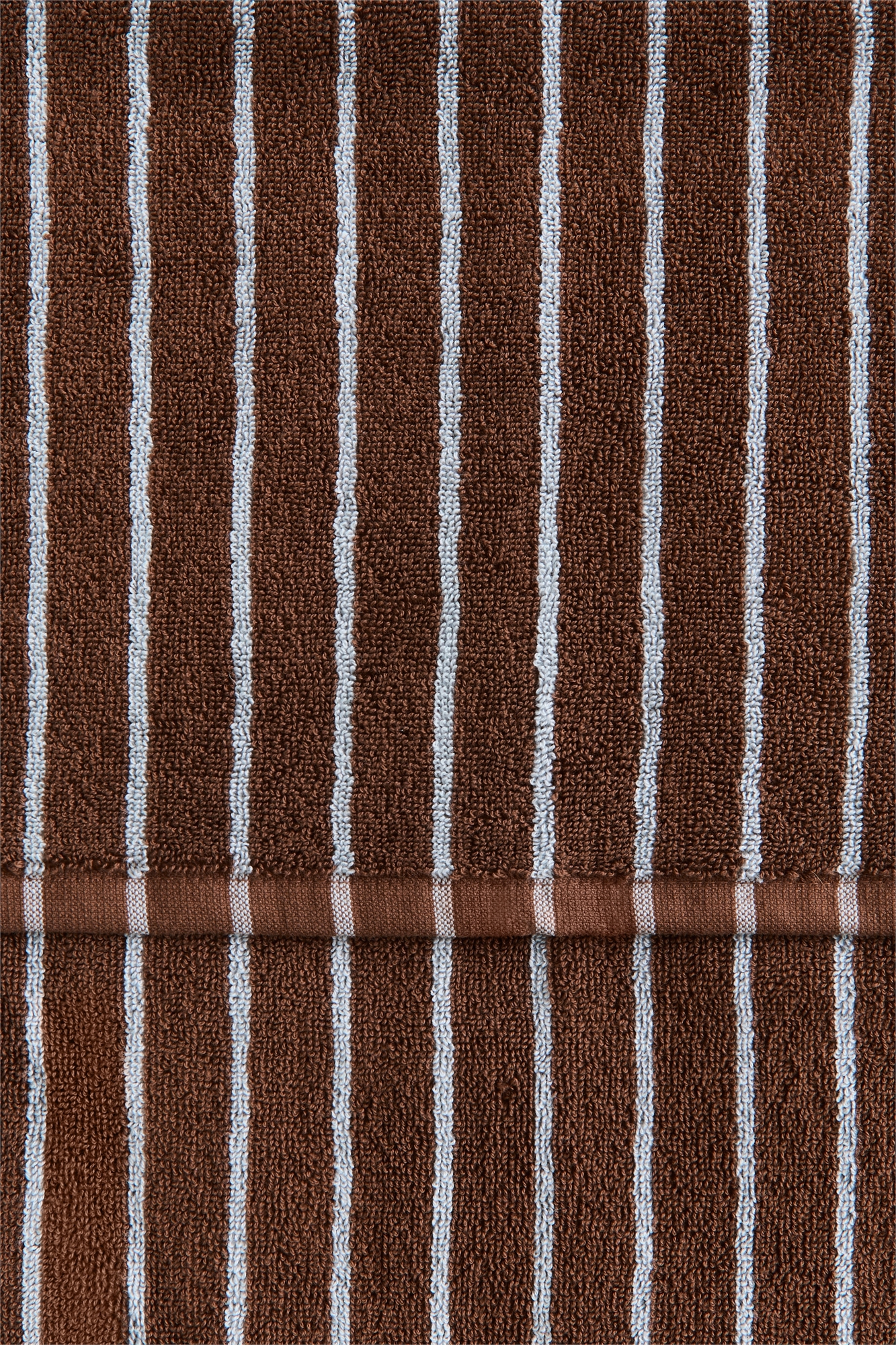 Гостевое полотенце из мягкой хлопковой махры с высокой степенью впитываемости. Полосы, окрашенные пряжей, легко сочетаются с однотонными полотенцами, создавая современный и элегантный образ дома. Петля в верхней части для подвешивания. Вес: 480 GSM.
