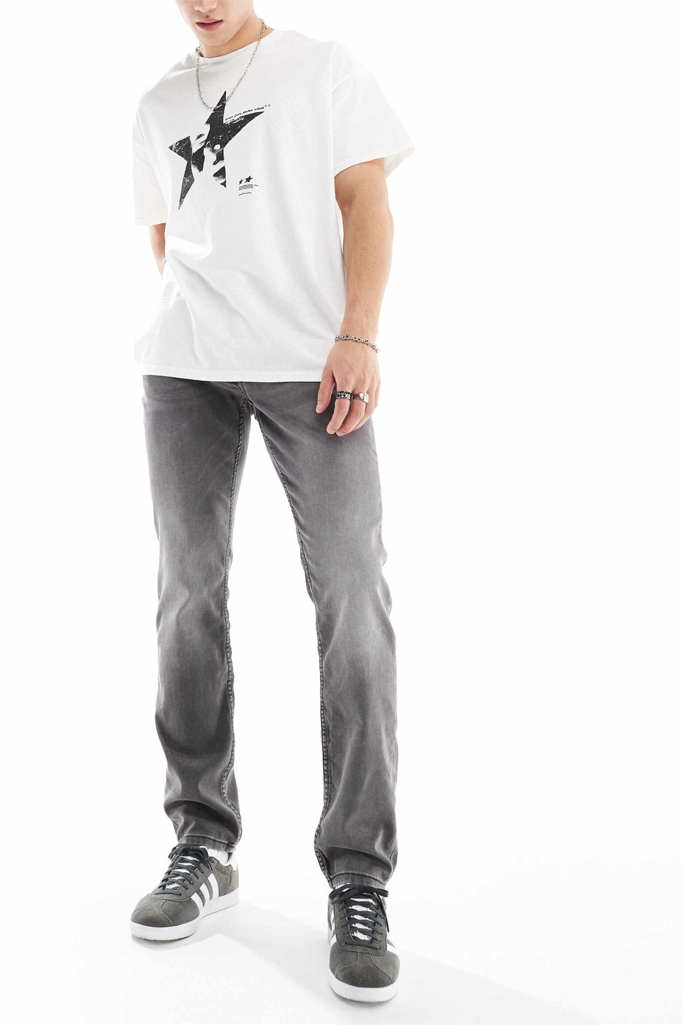 Эластичный деним: серая стирка Основной материал: 91% хлопок, 7% полиэстер, 2% эластан.