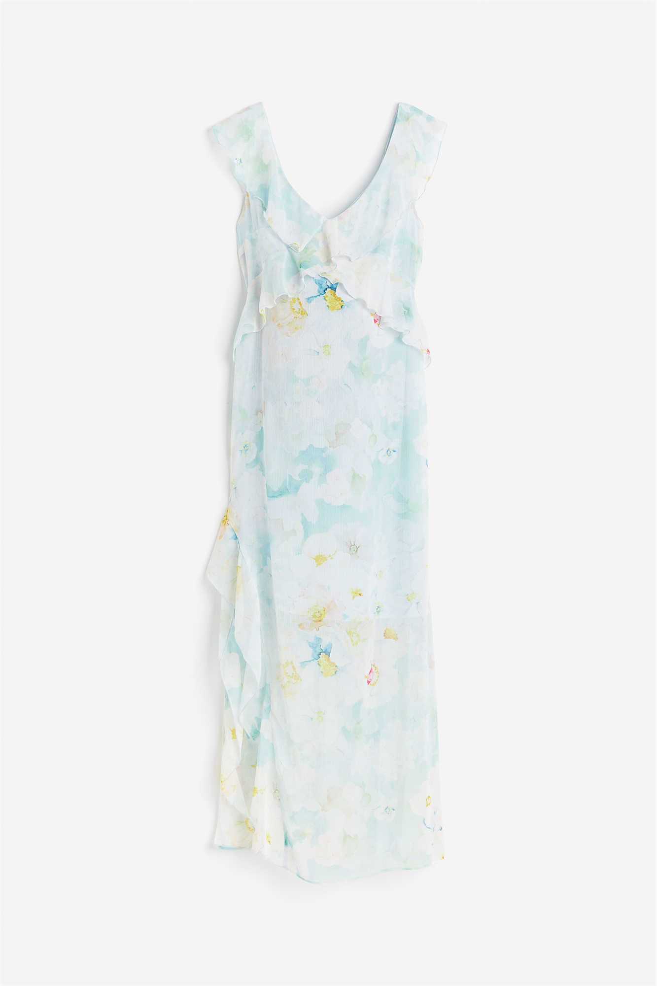 Платье длиной до щиколотки из ткани с воланами. Глубокий V-образный вырез и широкие бретели с воланами, продолжающимися спереди и сзади. Скрытая застежка-молния с одной стороны и прямой подол с высоким разрезом, отделанным воланами. Частично на подкладке.