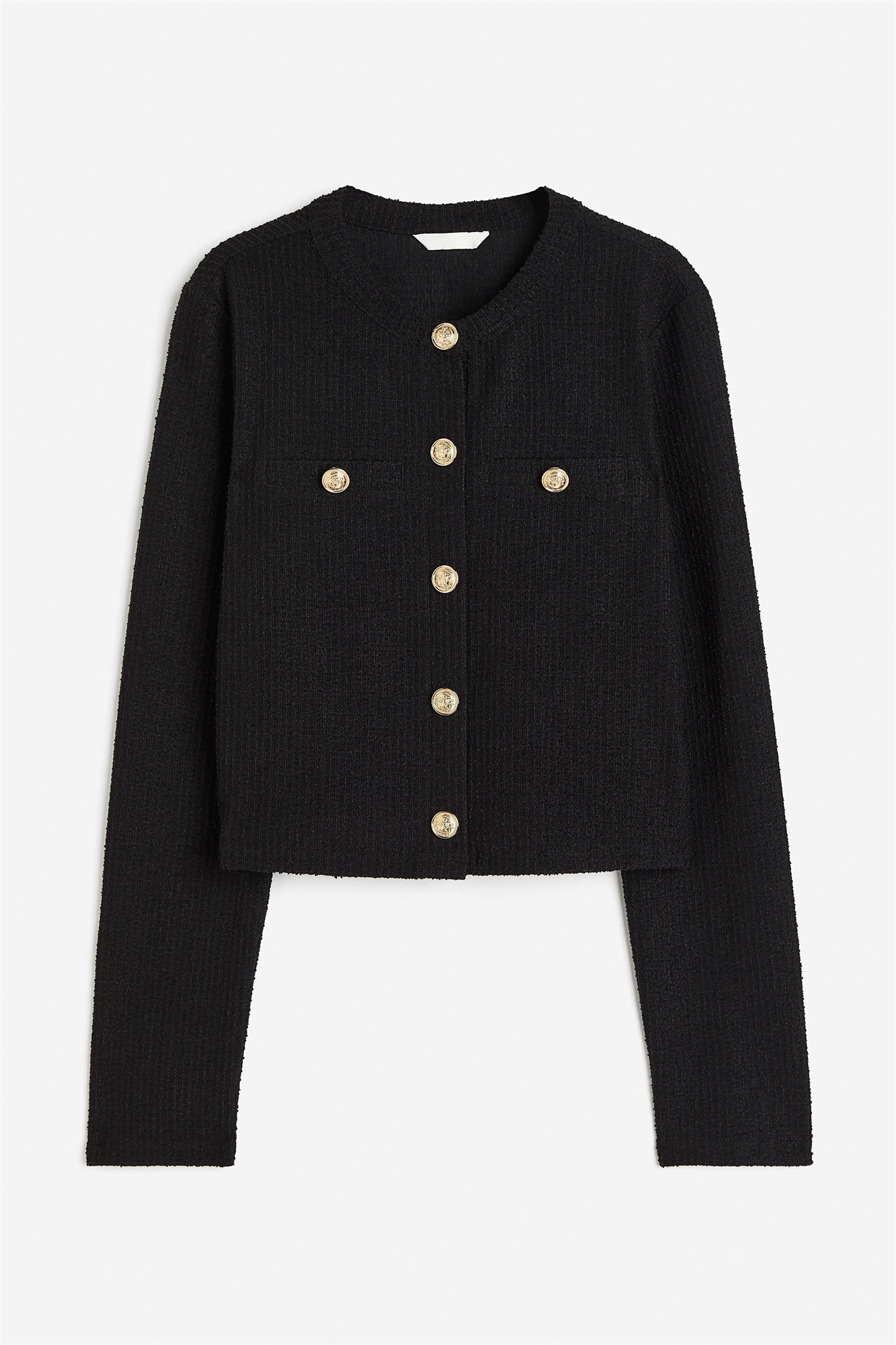Короткий кардиган из фактурного трикотажа. С круглым вырезом, застежкой на пуговицы и нагрудными карманами с пуговицей золотистого цвета.