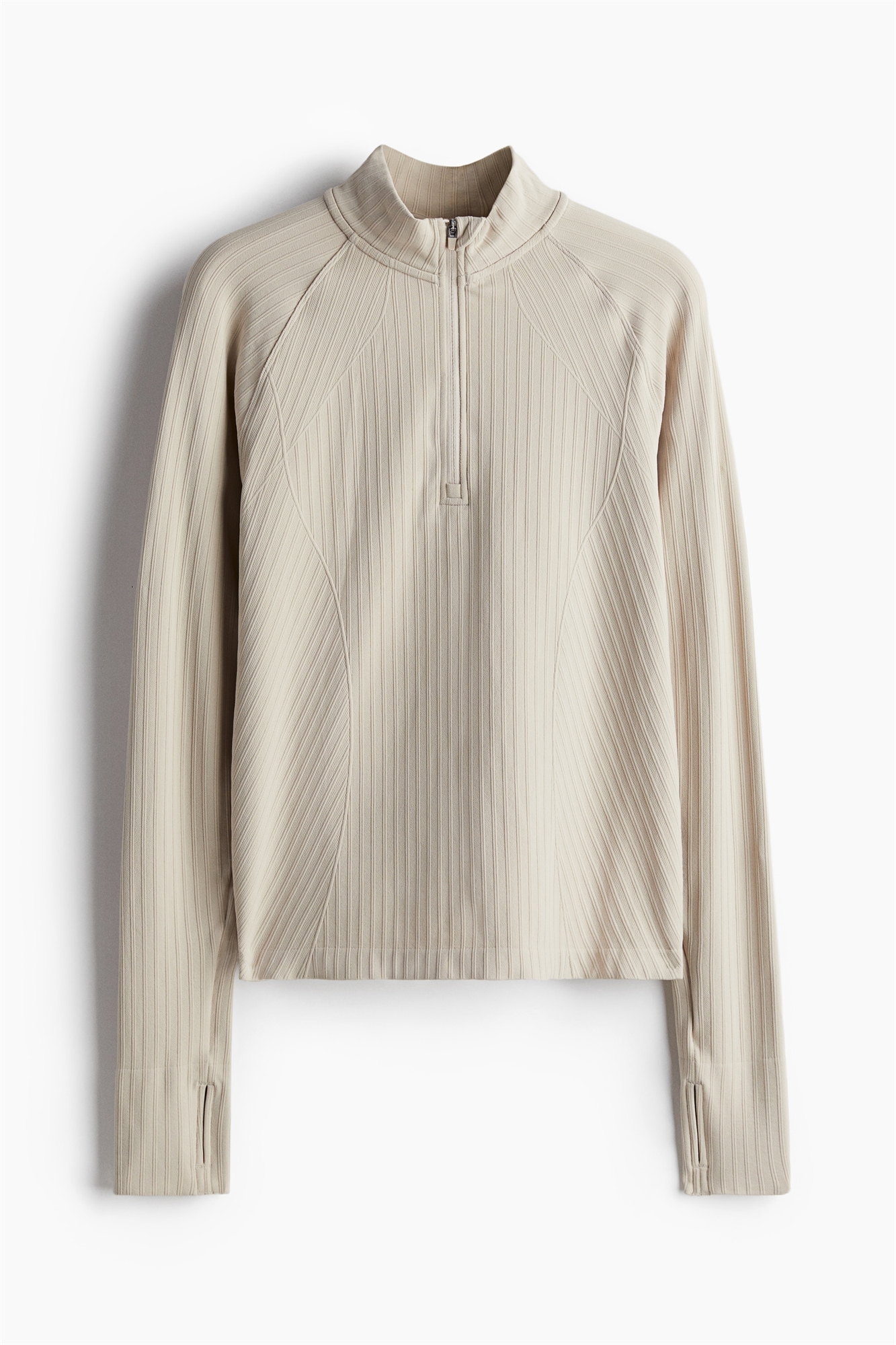 Спортивный топ из ребристой функциональной ткани с добавлением DryMove™, которая отводит влагу от кожи, обеспечивая комфортную сухость во время движения. Облегающий крой с воротником-стойкой, застежка-молния в верхней части с защитой подбородка от натирания и удлиненные рукава реглан с отверстием для большого пальца на манжетах. Верхняя часть выполнена с минимальным количеством швов для более комфортной посадки и повышенной подвижности.