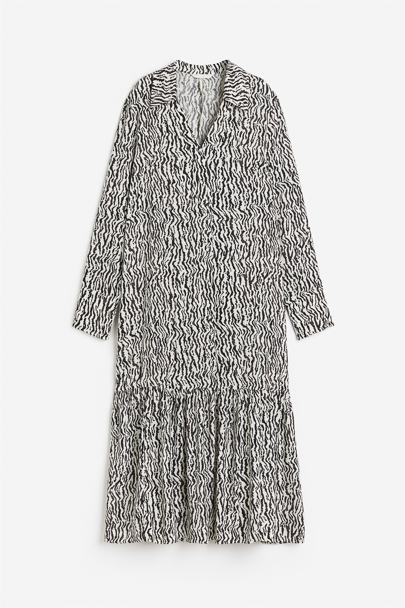 Платье длиной до колен из вискозы с воротником, V-образной проймой спереди, длинными рукавами и широкими манжетами с разрезом и пуговицей. Присборенный шов ниже бедер для придания дополнительной ширины. Без отделки.