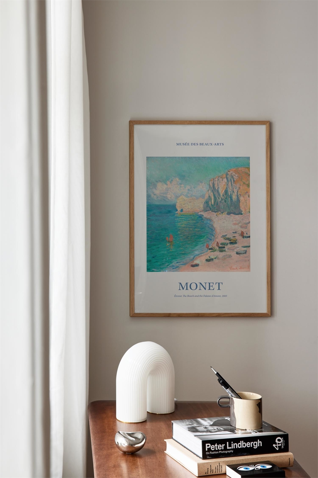 Картина с изображением пляжа с большими скалами на заднем плане. Клод Моне создал ее в 1885 году.