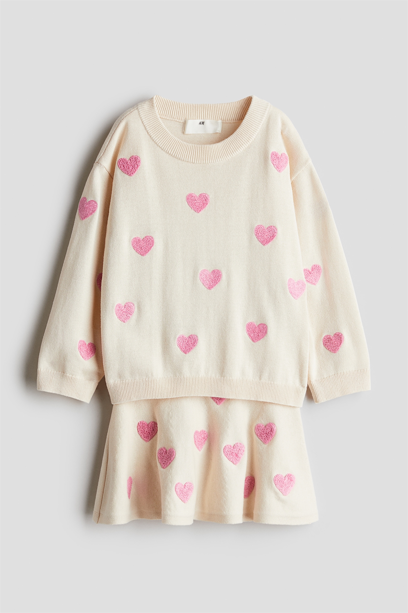 Комплект из джемпера и юбки из мягкого хлопка тонкой вязки. Джемпер с длинными рукавами, круглым вырезом с ребристой отделкой, спущенными плечами и окантовкой манжет и подола. Расклешенная юбка с эластичной резинкой на талии.