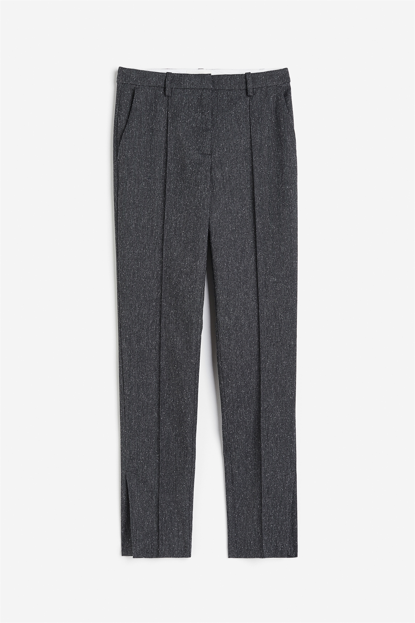 Брюки из тканого материала с зауженной талией и ширинкой на молнии с потайной застежкой на пуговицу и крючок с ушком. Диагональные боковые карманы, втачные задние карманы и зауженные ноги со складками спереди и сзади. Разрезы на подоле с одной стороны.