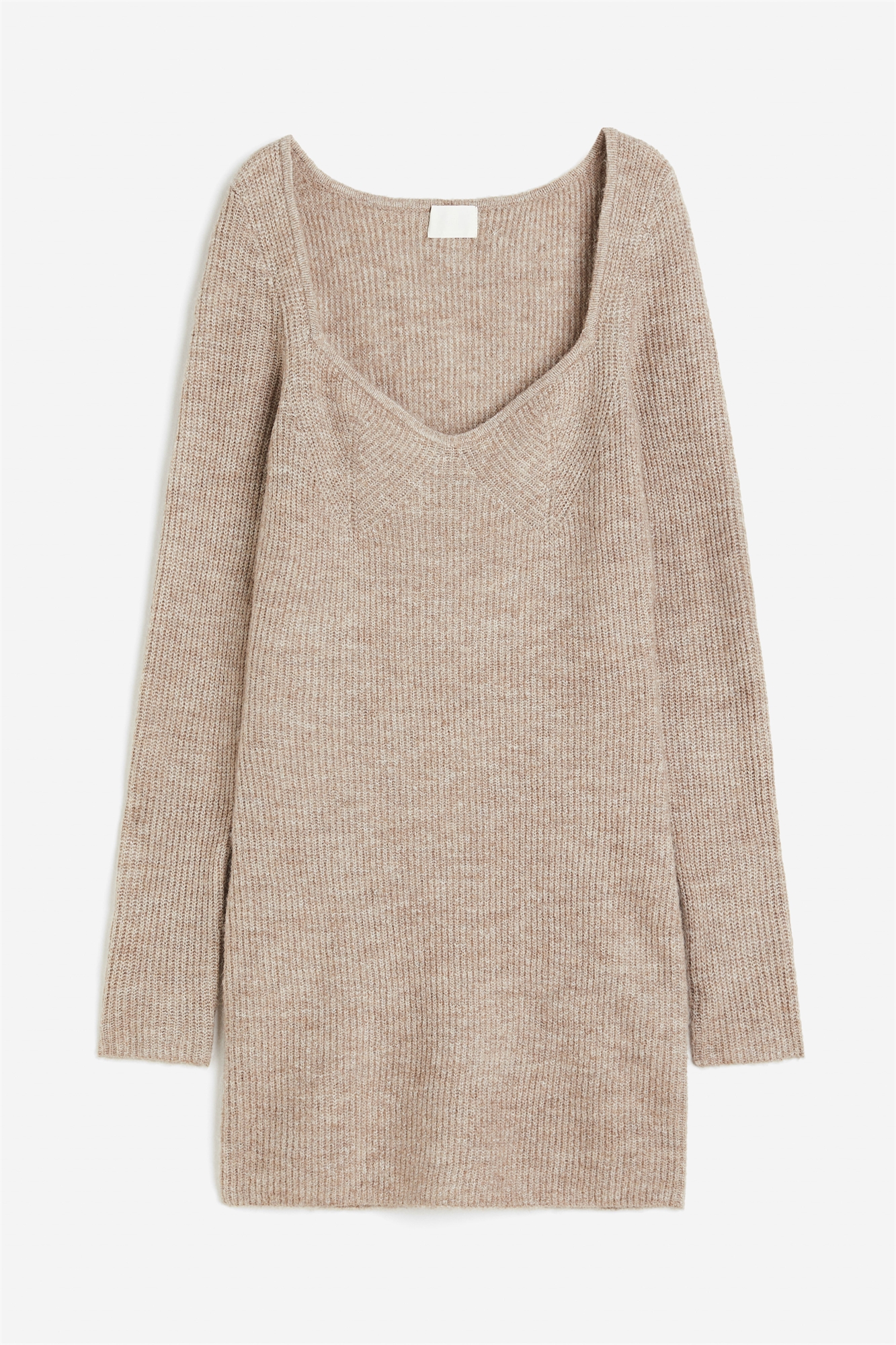 Короткое приталенное платье из мягкого трикотажа в рубчик с вырезом в форме сердца, цельнокроеным разрезом на бюсте и длинными рукавами.