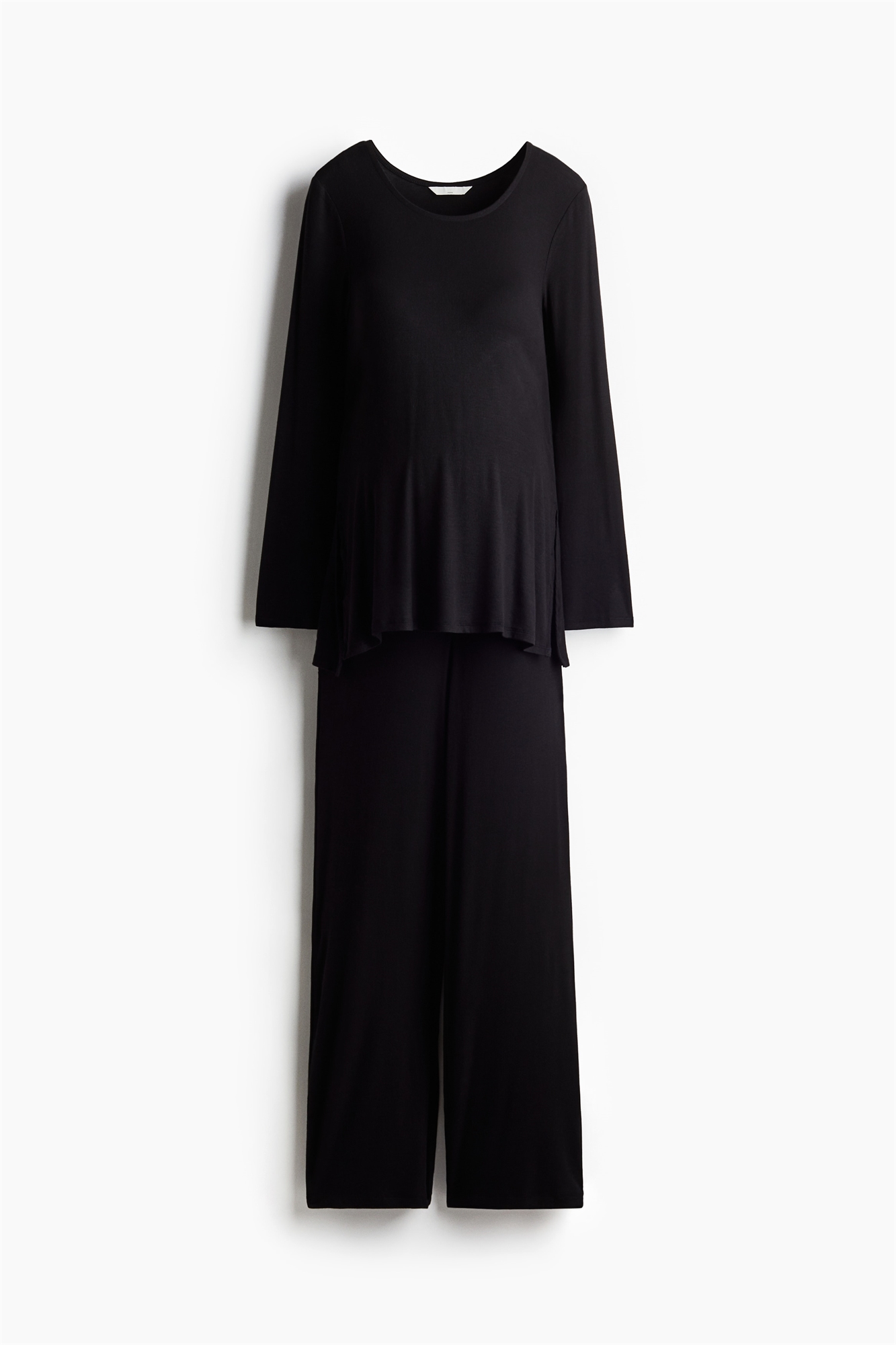 Комплект из топа и брюк из мягкого, ребристого вискозного трикотажа. Топ с круглым вырезом, длинными рукавами с разрезом на манжетах и прямым подолом с разрезом с каждой стороны. Прямые брюки с широким отложным поясом. Комплект можно носить как во время, так и после беременности.
