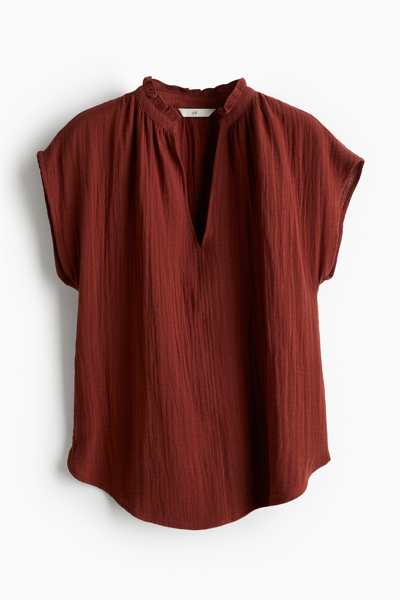 Свободная блузка из хлопка двойного плетения с круглым вырезом с оборкой, V-образной проймой спереди и рукавами-капителью. Закругленный подол.