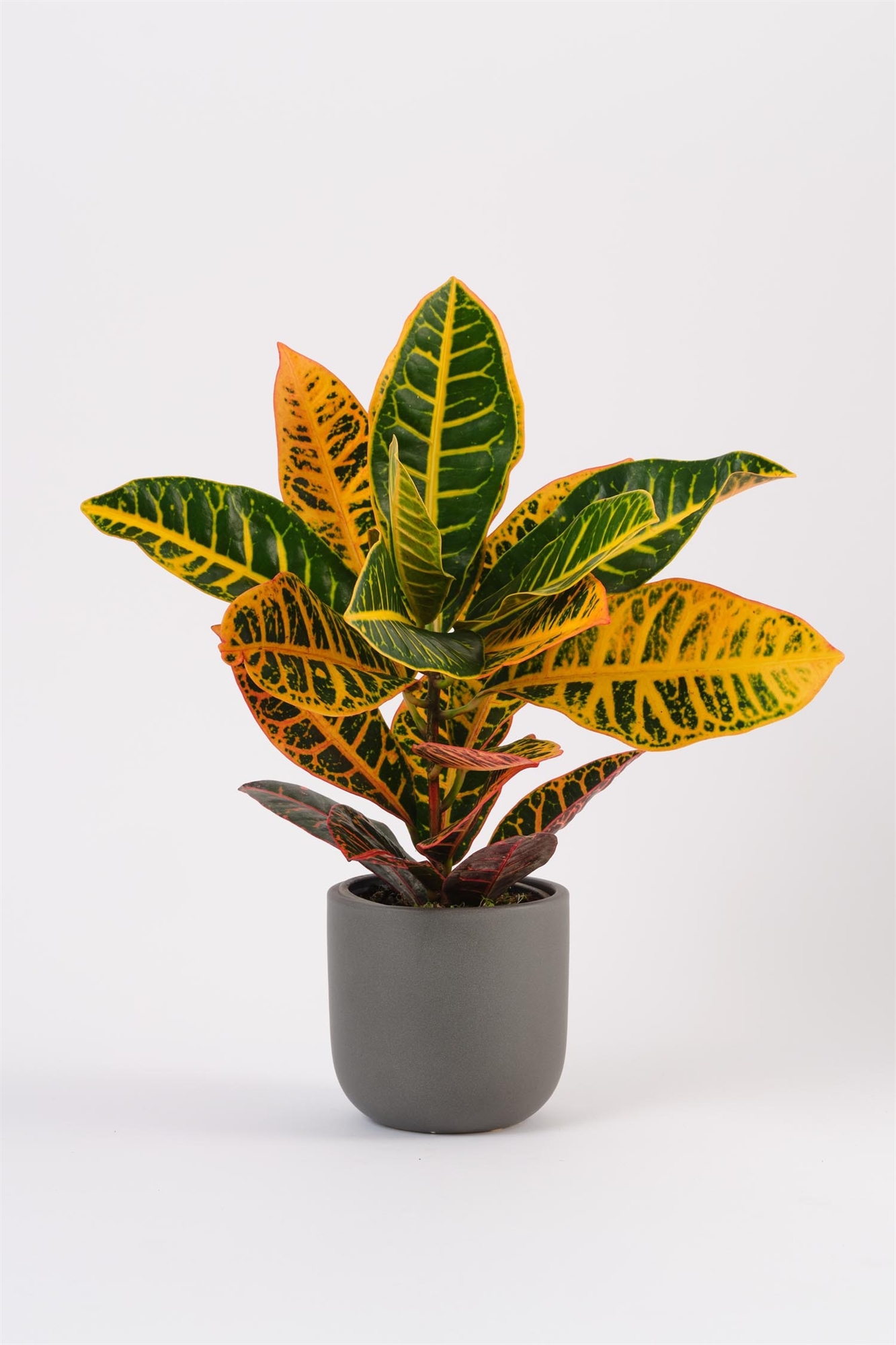 Это поразительное растение кротон не перестает вызывать разговоры! Естественный экспонат с красивыми пестрыми листьями зеленого, оранжевого, желтого и красного цветов, Codiaeum variegatum родом из западной части Тихоокеанского региона. Как и большинство тропических растений, он предпочитает теплую влажную среду, поэтому не забывайте регулярно его поливать. Вы сможете определить, что ваш кротон испытывает жажду, так как его листья поникнут. Размеры этого растения - W12 см x H30-40 см. Держите это растение в недоступном для пушистых друзей и маленьких людей месте. В комплект не входит декоративный горшок. Товар может отличаться и не подлежит возврату из-за особенностей изделия.