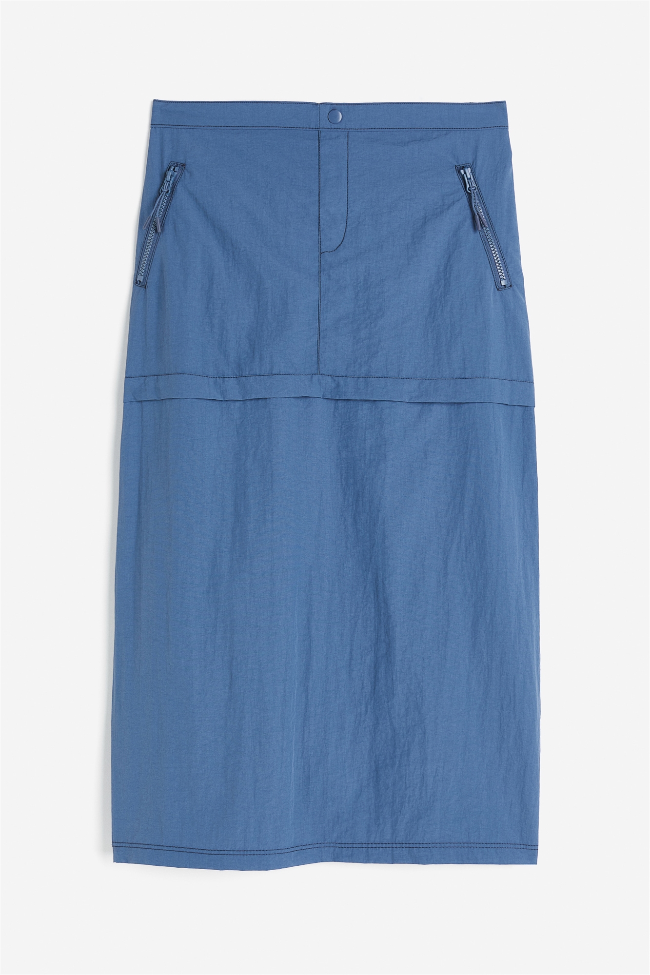 Юбка длиной до колен из тканого материала с эластичной отделкой сзади на талии и фальшивой ширинкой с кнопкой. Диагональные передние карманы на молнии, видимый шов на бедрах и подол прямого кроя с высоким разрезом сзади. Без подкладки.