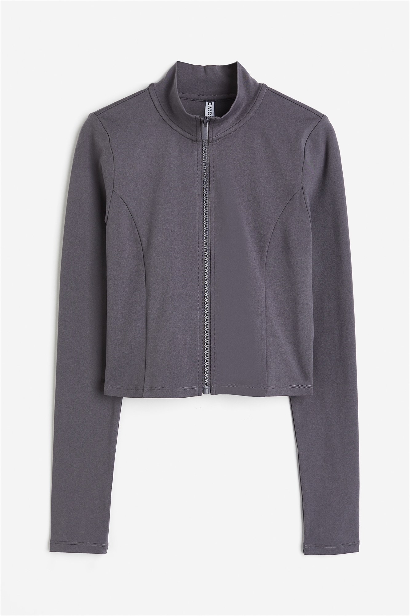 Спортивная куртка из джерси-стрейч с видимыми швами спереди для создания облегающего силуэта. Модель с прямым подолом, воротником-стойкой и застежкой-молнией спереди.