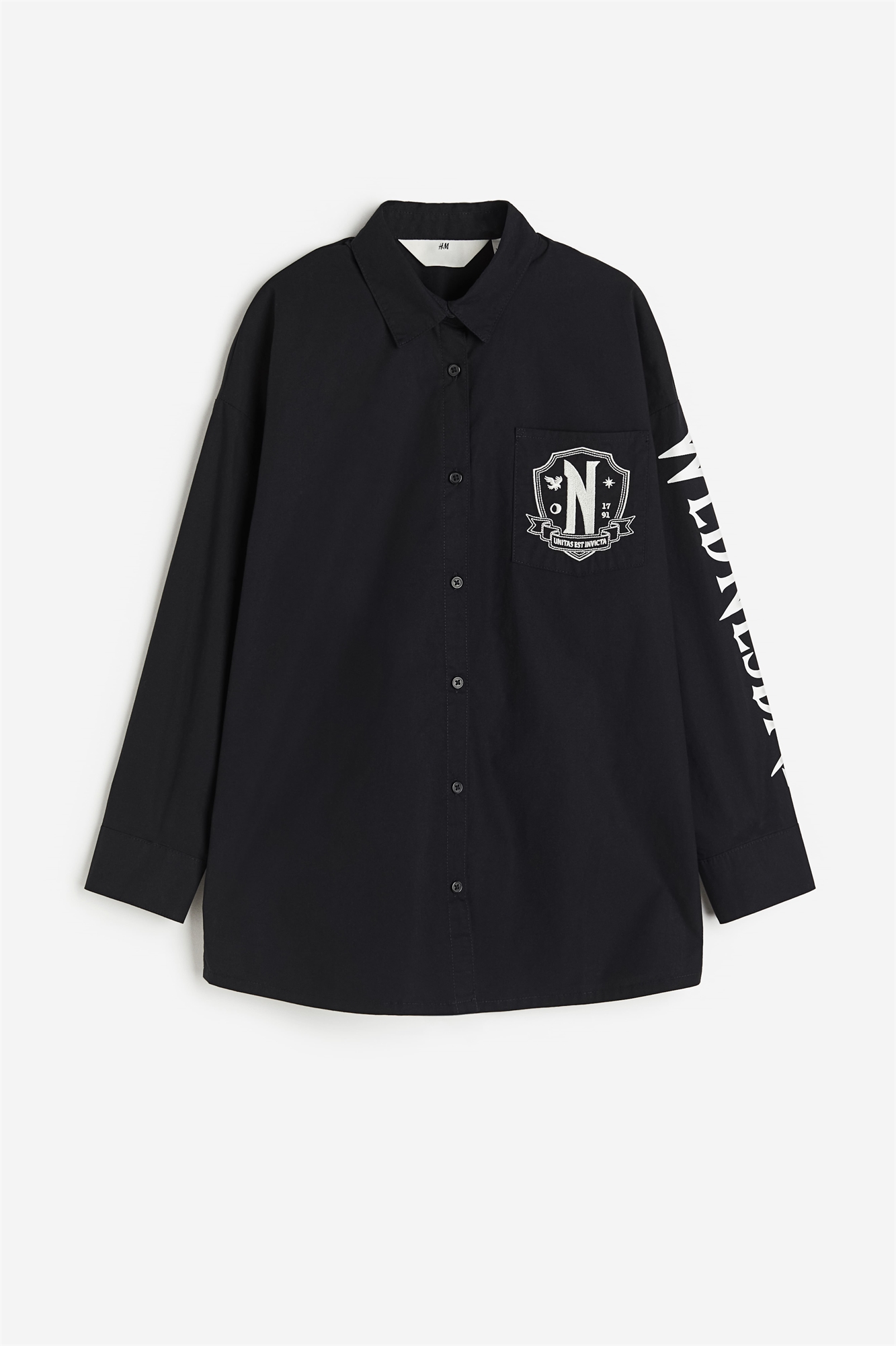 Свободная рубашка из хлопкового полотна с принтом на спине и вышитым мотивом на нагрудном кармане. Воротник, застежка на пуговицы спереди, спущенные плечи и длинные рукава с манжетами на пуговицах. Закругленный подол, слегка удлиненный сзади.