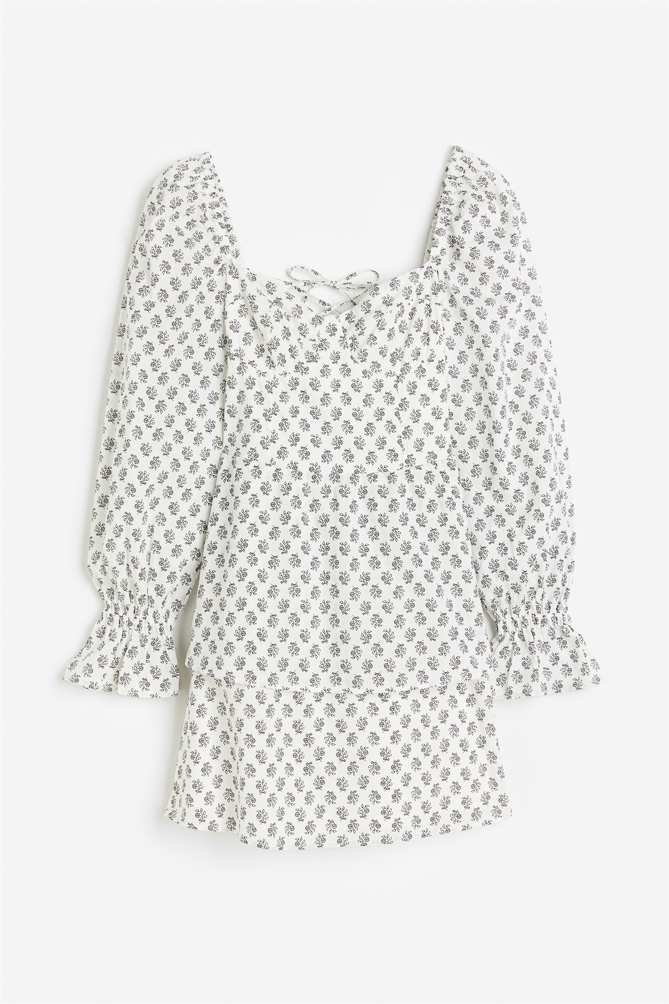 Короткое платье из воздушного хлопкового полотна с вырезом в форме сердца и приталенным лифом с формованными чашечками. Длинные рукава, расклешенные манжеты и частично открытая спина со шнуровкой. Узкая эластичная резинка на плечах, манжетах и спине. Присборенный шов на талии и расклешенная многоярусная юбка. Частично на подкладке.