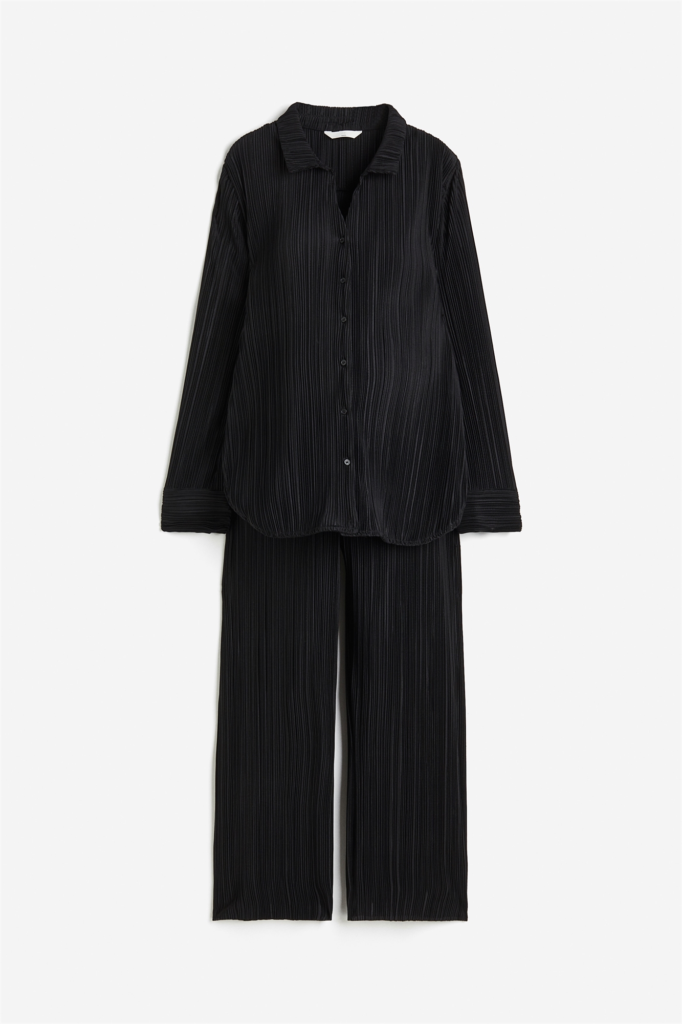 Комплект из рубашки и брюк из плиссированного трикотажа. Рубашка с воротником, V-образной проймой, пуговицами спереди и ярмом со складкой сзади. Длинные рукава с разрезом и пуговицей на манжетах. Закругленный подол. Брюки с высокой эластичной талией и широкими штанинами.