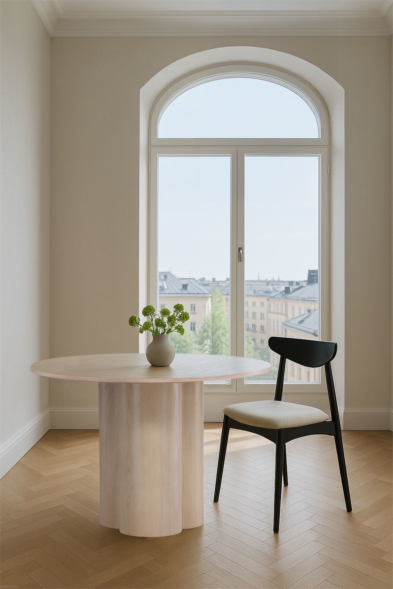 Обеденный стол Olivia впечатляет своим скандинавским дизайном и удачной формой! Конструкция выполнена в едином стиле из МДФ. Он состоит из тонкой круглой столешницы и трех цилиндрических ножек, которые соединяются в центре под ней. Цвет шпонированной столешницы слегка непрозрачен, что позволяет увидеть рисунок древесины. Это придает столу жизнь и движение. Создайте стильный центральный элемент в сердце вашего дома вместе с Olivia! Высота: 75 см Диаметр: 110 см