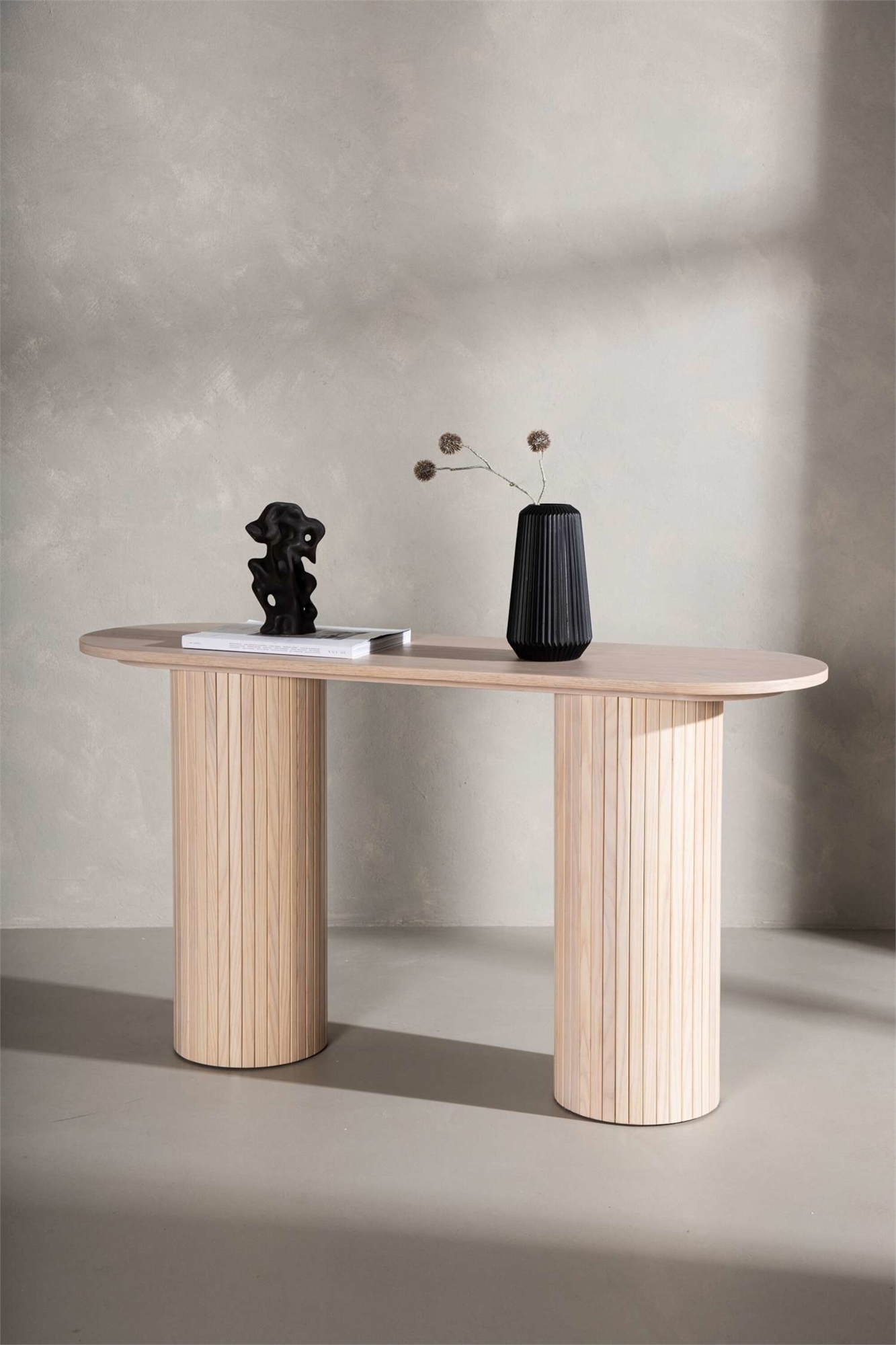 Придайте вашей гостиной или прихожей современный вид с помощью этого стильного журнального столика Bianca. Столик изготовлен из шпонированного МДФ с элегантной полированной отделкой. Прочный каркас состоит из двух цилиндрических ножек с ребристым рисунком. Изысканный общий дизайн с мягкими скандинавскими формами придает комнате теплый, но современный вид. Стол настолько же стильный, насколько и практичный, и находится прямо в тренде - отличное дополнение к вашему дому! Высота: 72 см, Длина: 130 см, Ширина: 40 см