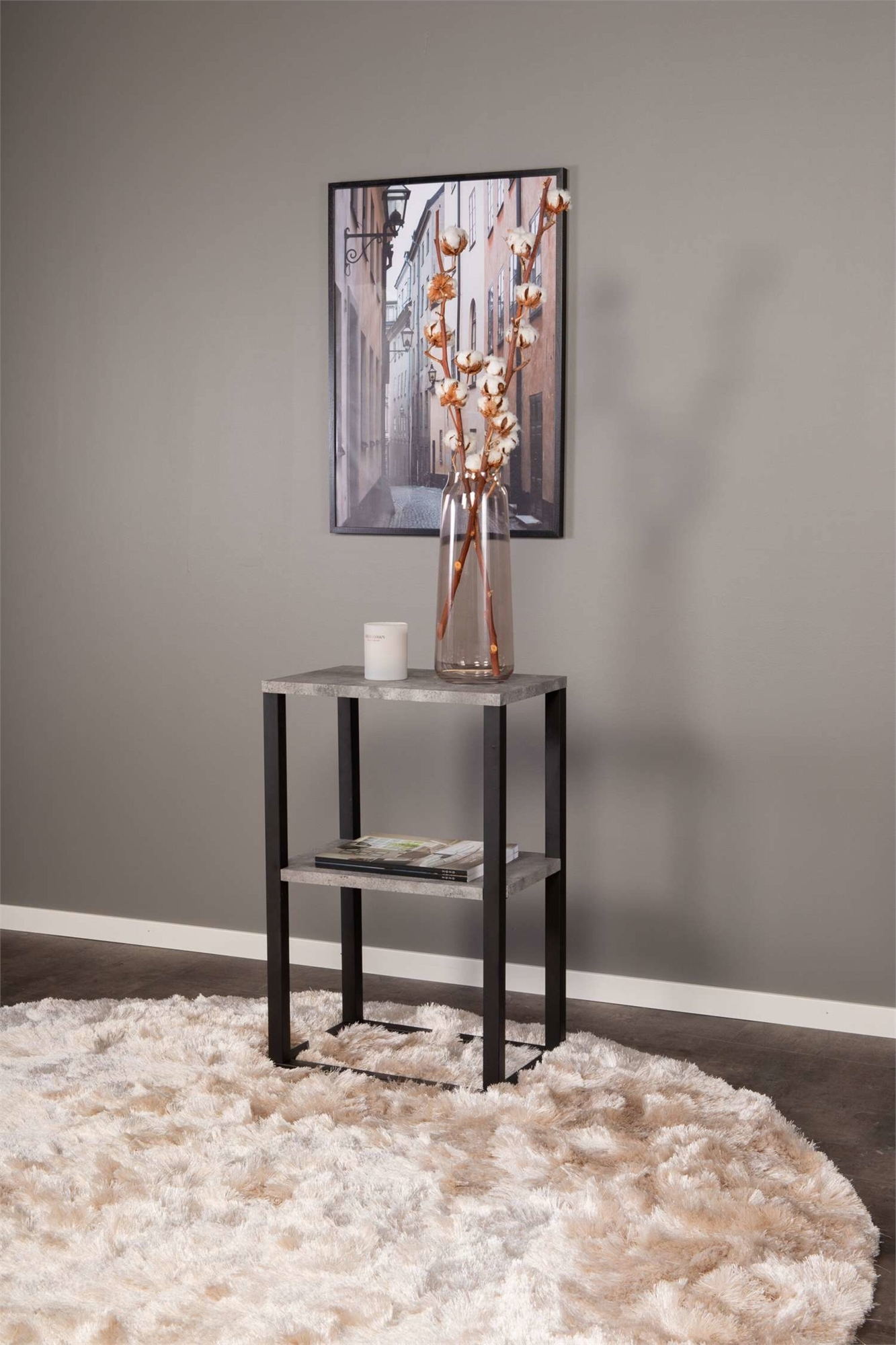 Прикроватная тумбочка с модным и практичным дизайном! Прикроватная тумба Rise оснащена двумя продуманными полками из МДФ со стильной имитацией бетона. Бетонная отделка прекрасно сочетается с металлическим каркасом и позволяет легко комбинировать столик с другими предметами мебели. Изящная конструкция создает стильное впечатление. В спальне в качестве прикроватной тумбы или в гостиной в качестве приставного столика - варианты использования безграничны! Высота: 70 см, длина: 45 см, ширина: 30 см