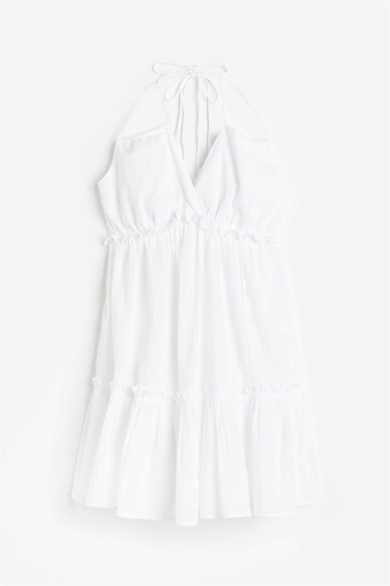 Короткое платье из хлопчатобумажной ткани с V-образной проймой и небольшим накладным разрезом спереди. Горловина халтер с двойными бретелями-спагетти, которые продеваются через верх и завязываются на затылке. Задняя часть со швом и небольшая отделка воланами под бюстом и на бедрах. Слегка расклешенная юбка. На подкладке.