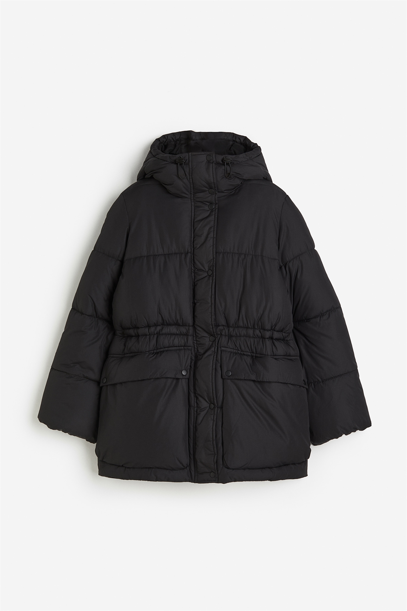 Пуховая куртка больших размеров из стеганого полотна с капюшоном на завязках, воротником-стойкой, застежкой-молнией и ветрозащитным клапаном с кнопками для прижима спереди. Длинные рукава с эластичными манжетами и передние карманы с клапаном и кнопками. Скрытый шнурок на талии для регулировки посадки. На подкладке.