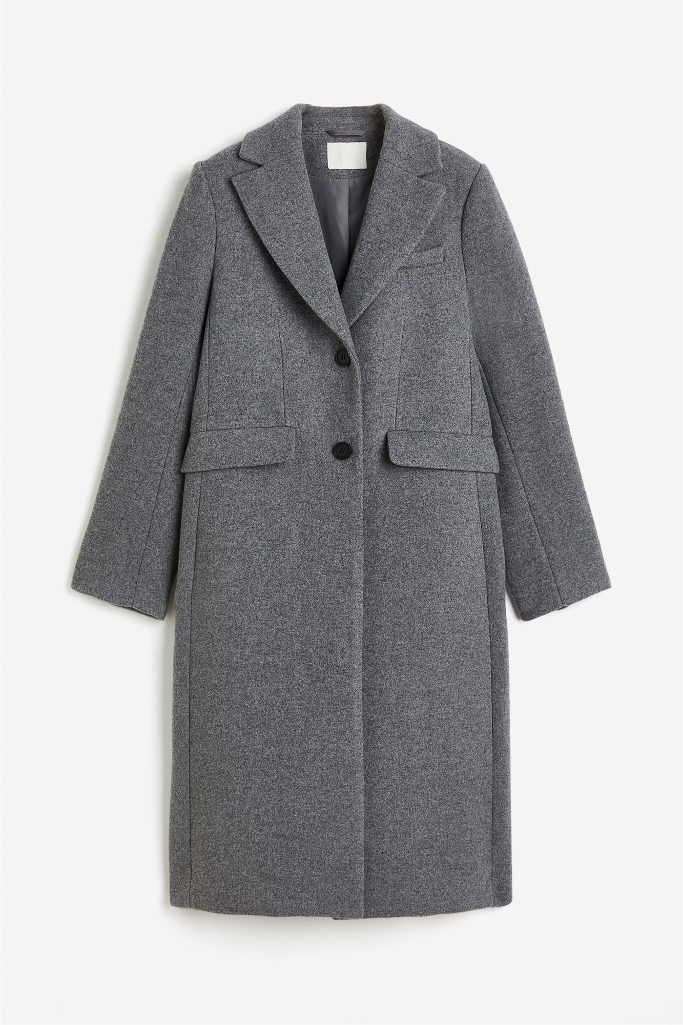 Однобортное пальто из ткани длиной до колен с лацканами с вырезом и пуговицами спереди. Модель с подплечниками и декоративными пуговицами на рукавах. Накладные карманы спереди, накладной карман на груди и походный разрез сзади. На подкладке.