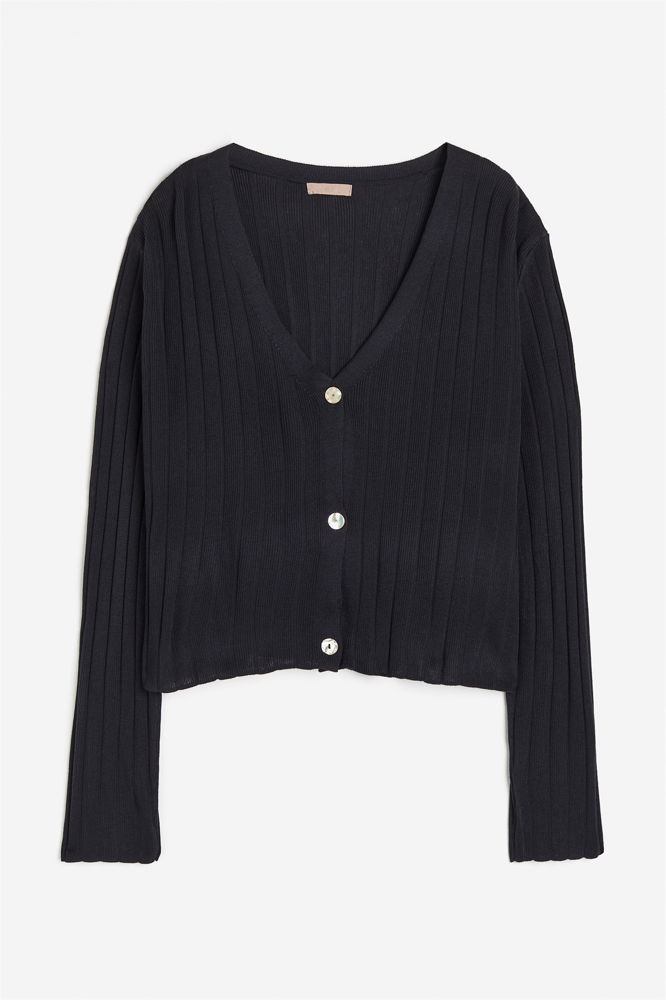Короткий кардиган из тонкой вискозной ткани с ребристой вязкой. Свободный крой с глубоким V-образным вырезом, перламутровые пуговицы спереди, слегка спущенные плечи и длинные рукава.